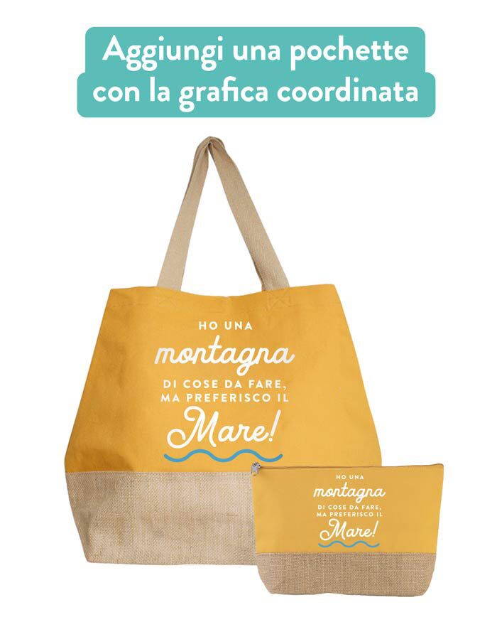 Simpaticissima borsa bicolor in juta e cotone con scritta “Ho una montagna di cose da fare ma preferisco il mare”, perfetta per essere sfoggiata durante le tue uscite estive. Ideale come idea regalo, sarà un pensiero graditissimo per la vostra mamma, sorella o la vostra amica del cuore! La scritta non è modificabile.