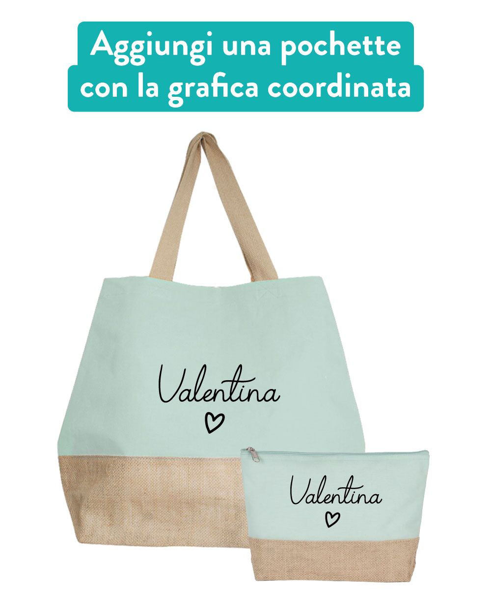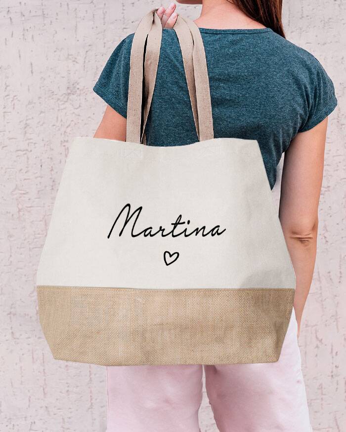 La Borsa Bicolor in Cotone e Juta Personalizzabile con Nome e Cuore è l’ideale come regalo e accessorio per l’addio al nubilato in spiaggia, offrendoti stile e comodità!