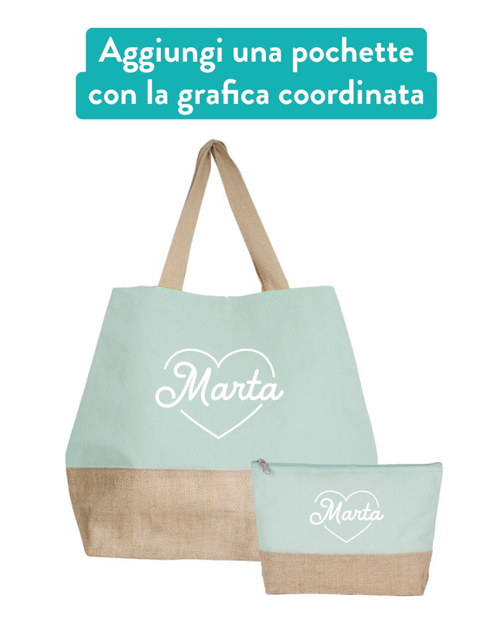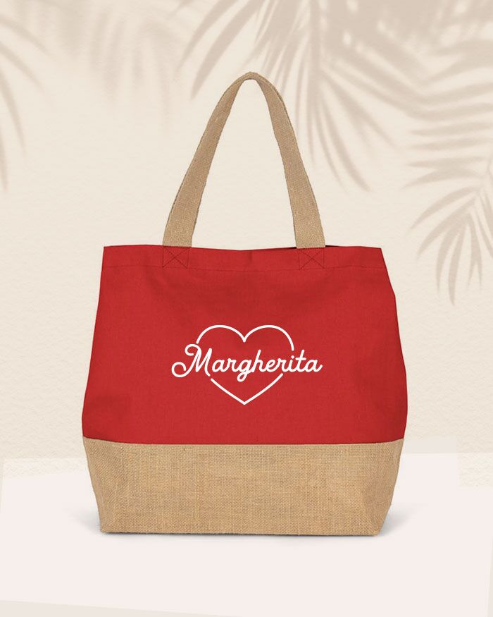 Carinissima borsa bicolor in juta e cotone con cuore personalizzabile con il proprio nome, ideale per accompagnarvi durante le vostre uscite estive. Eccezionale anche come idea regalo, sarà un omaggio graditissimo per la vostra mamma, sorella o la vostra amica del cuore!