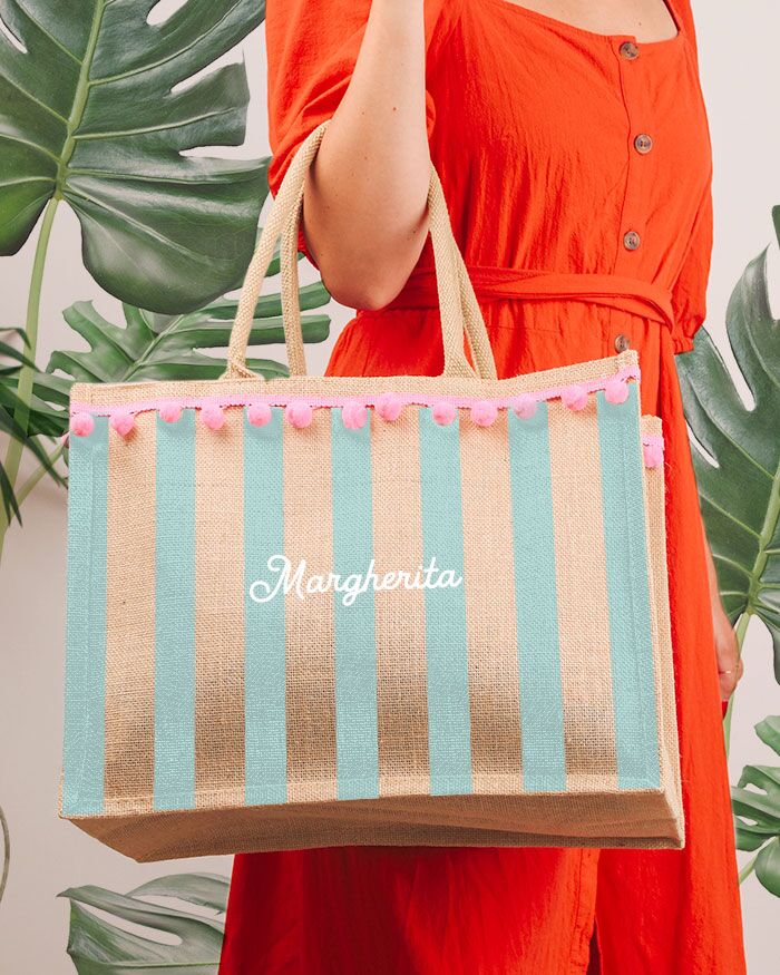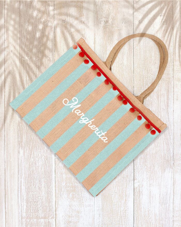 Borsa da mare in juta personalizzabile con nome e pon pon, perfetta per essere portata in vacanza con voi e dare un look trendy e fashion al vostro outfit. Ideale anche come idea regalo per le amiche o la sorella che festeggia il suo compleanno in estate.