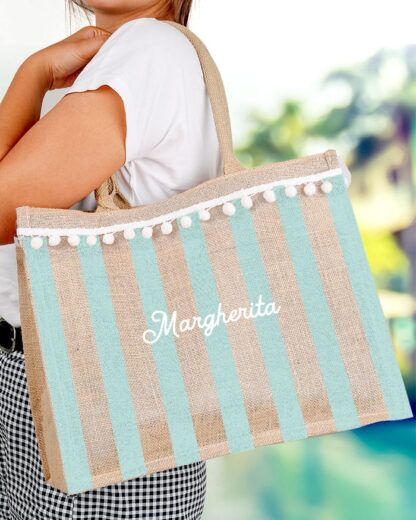 Borsa in Juta Personalizzabile con Pon Pon, Nome e Righe Azzurre – Idea Regalo Estate