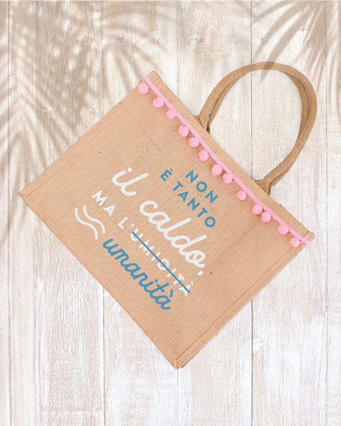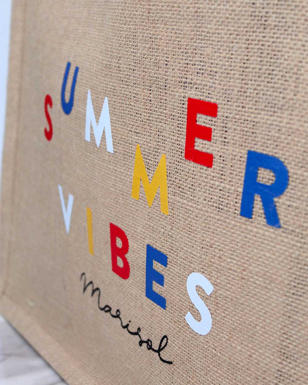 Borsa da mare in juta personalizzabile con nome, scritta “Summer Vibes” e pon pon, perfetta per essere portata in vacanza con te e dare un look trendy e fashion al tuo outfit. Sarà un regalo fantastico che lascerà a bocca aperta la fortunata destinataria di questo pensiero.