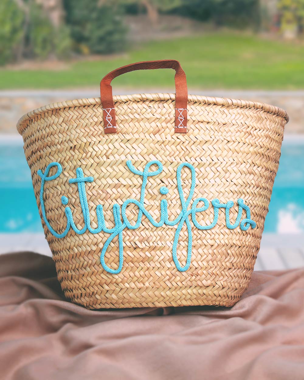Palma naturale intrecciata a mano da abili artigiani. Manici in sisal o in pelle. Nome in corda colorata assemblato a mano.