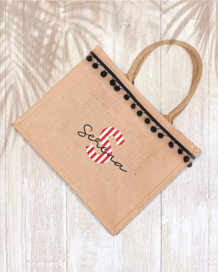 Borsa Personalizzata in Juta con Iniziale Nome e Pon Pon – Idea Regalo Estate