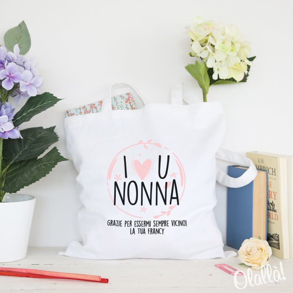 Bella, pratica, capiente ma soprattutto resistente, personalizzata con la tua frase sul fronte questa shopper sarà un’idea regalo perfetta per la tua super nonna per la Festa dei Nonni o per il suo compleanno. La stampa a caldo dona ai motivi e alle lettere stampate un effetto coprente totale: sono stampe estremamente resistenti e di grande qualità.