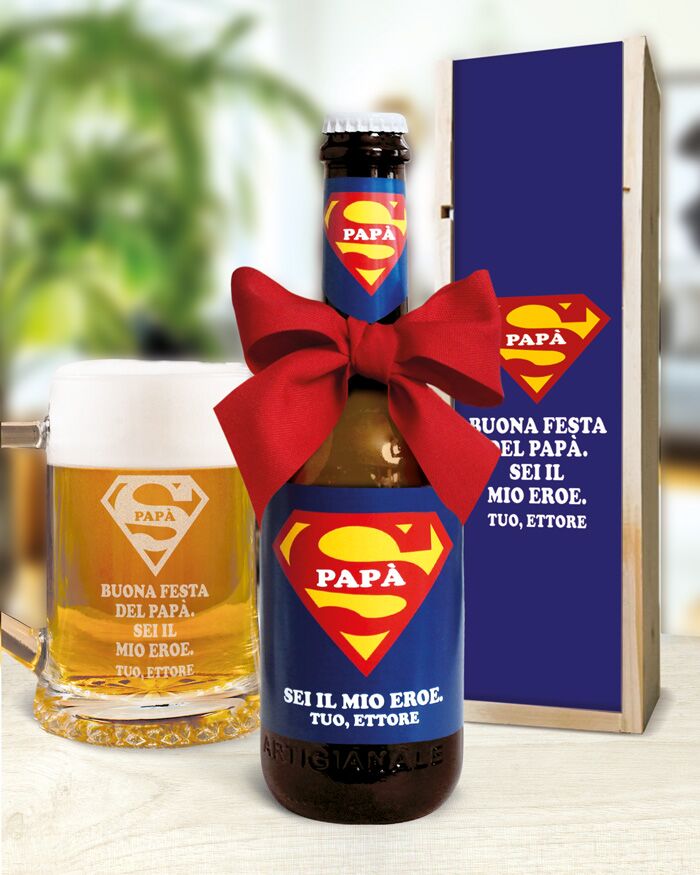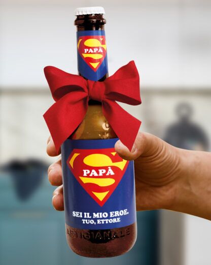 - PER VERI PAPÀ SUPEREROI! Fai rimanere il tuo papà di stucco con questa incredibile bottiglia di birra personalizzabile, dall’accattivante grafica a tema supereroe, personalizzabile con la tua speciale dedica.