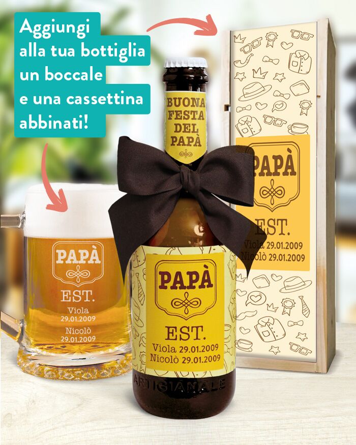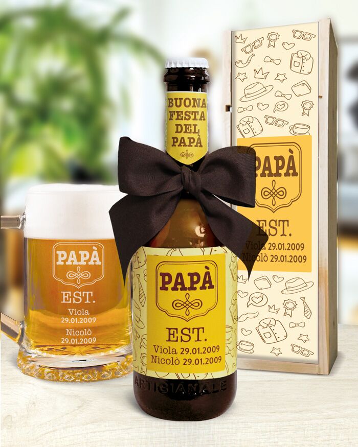 Se lo desideri, aggiungi un boccale da birra e una cassettina in legno con la stessa personalizzazione e crea un regalo davvero completo!