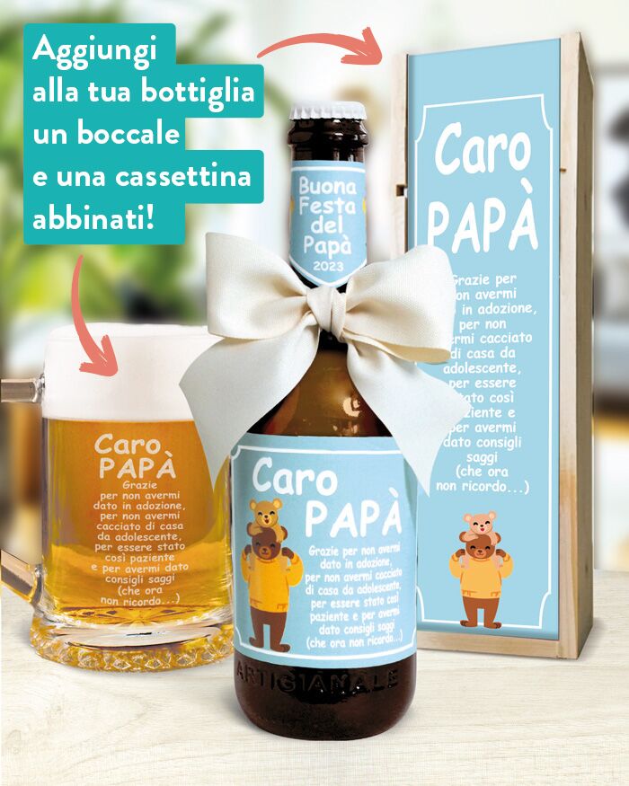 - UNA RINFRESCANTE BOTTIGLIA DI BIRRA PERSONALIZZATA: non è la solita bottiglia di birra! La magia di questa bottiglia di birra è proprio la sua personalizzazione. Puoi donare al tuo papà una bottiglia personalizzata unica ed inimitabile, fatta apposta per lui.