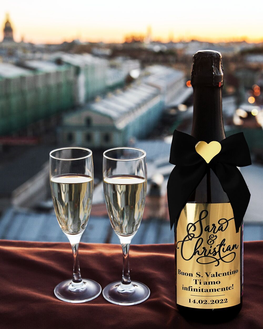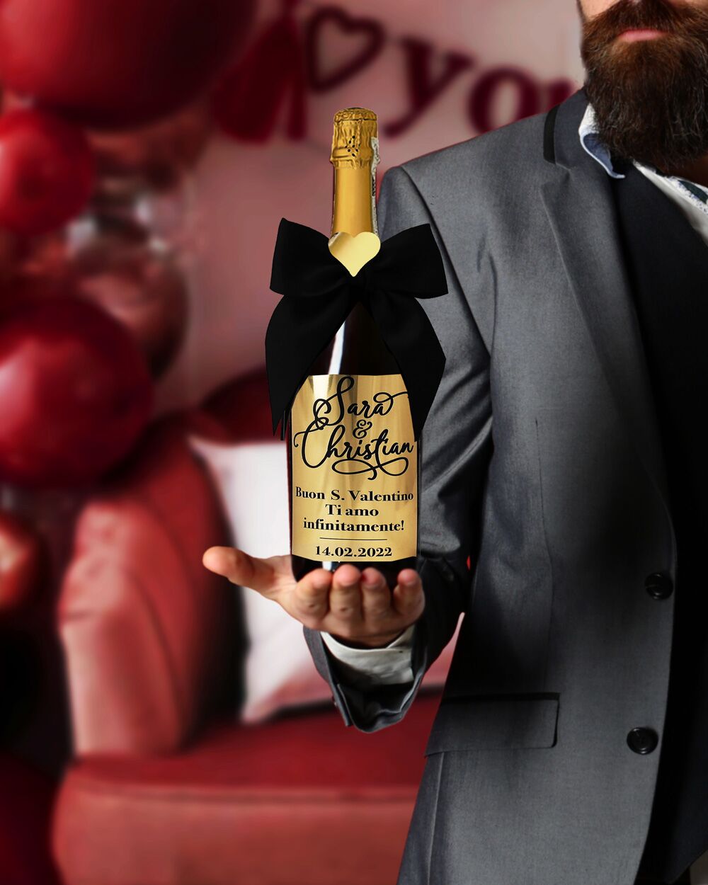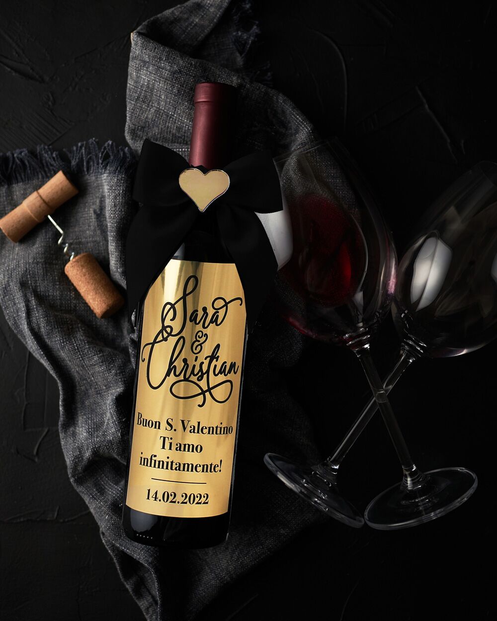 Una bottiglia di vino dalla lucente etichetta dorata con effetto a specchio, personalizzabile con i vostri nomi, una breve dedica secondaria e la vostra data del cuore. Un regalo perfetto per tuo marito o il tuo fidanzato, ideale per essere sorseggiato davanti una romantica cena al lume di candela in occasione di San Valentino o del vostro anniversario. Sarà un regalo diverso dal solito, unico e pieno d’amore!
