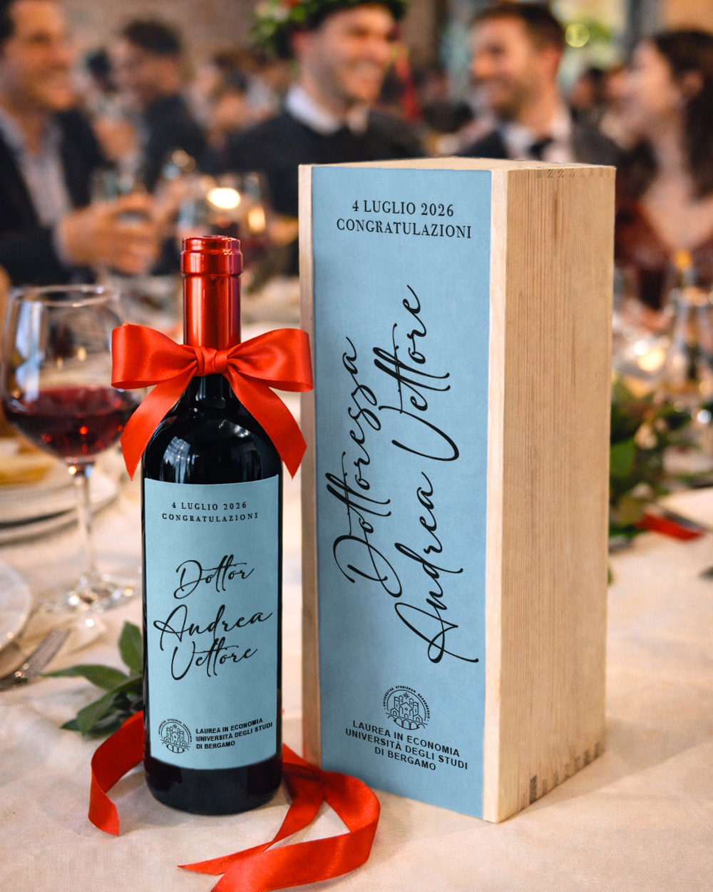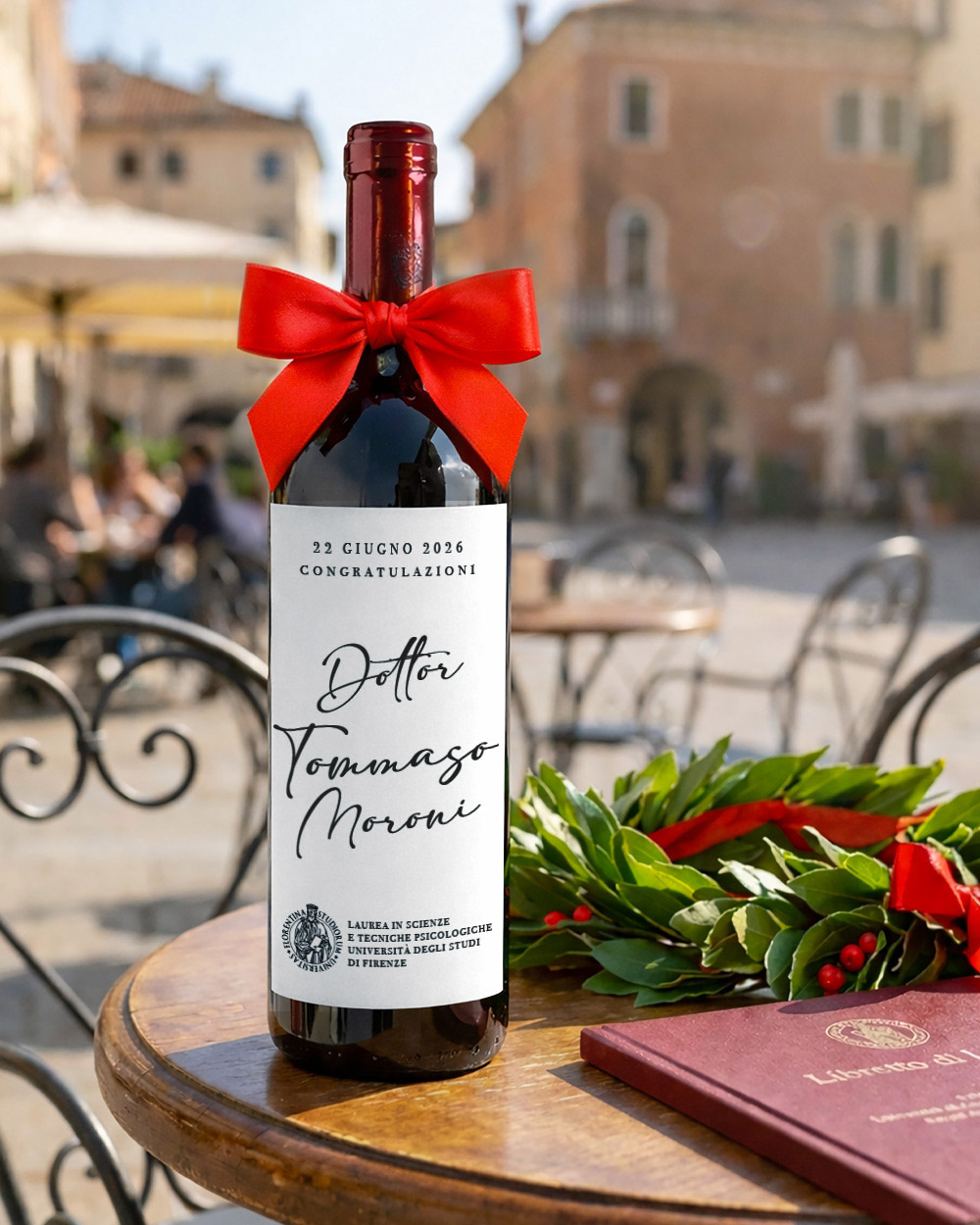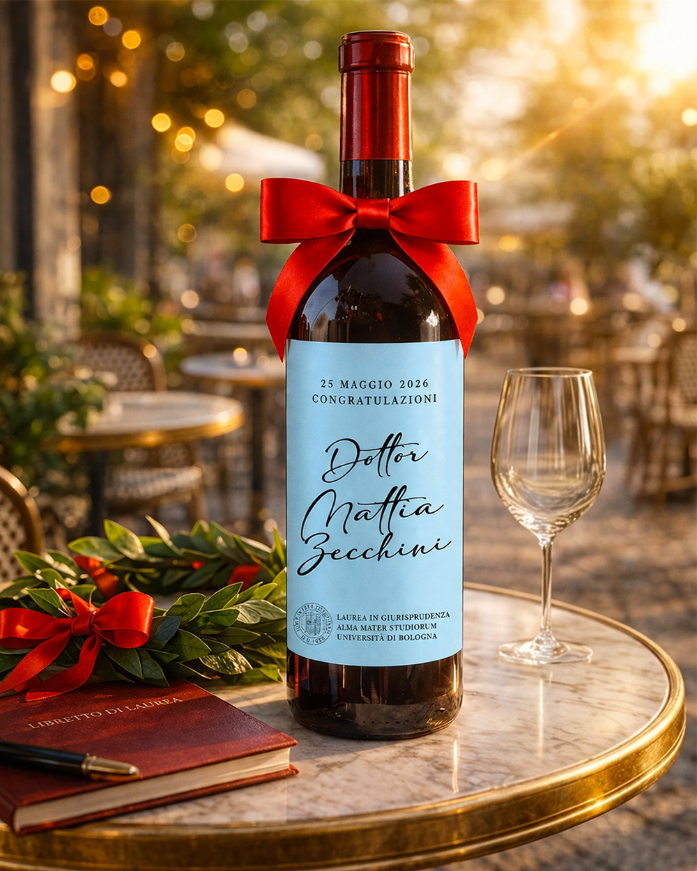C’è un momento preciso, durante una festa di laurea, in cui cala un silenzio diverso dagli altri: quando si stappa quella bottiglia e il neo-dottore o la neo-dottoressa legge il proprio nome scritto in corsivo elegante sull’etichetta. È lì che il regalo smette di essere un oggetto e diventa un ricordo.