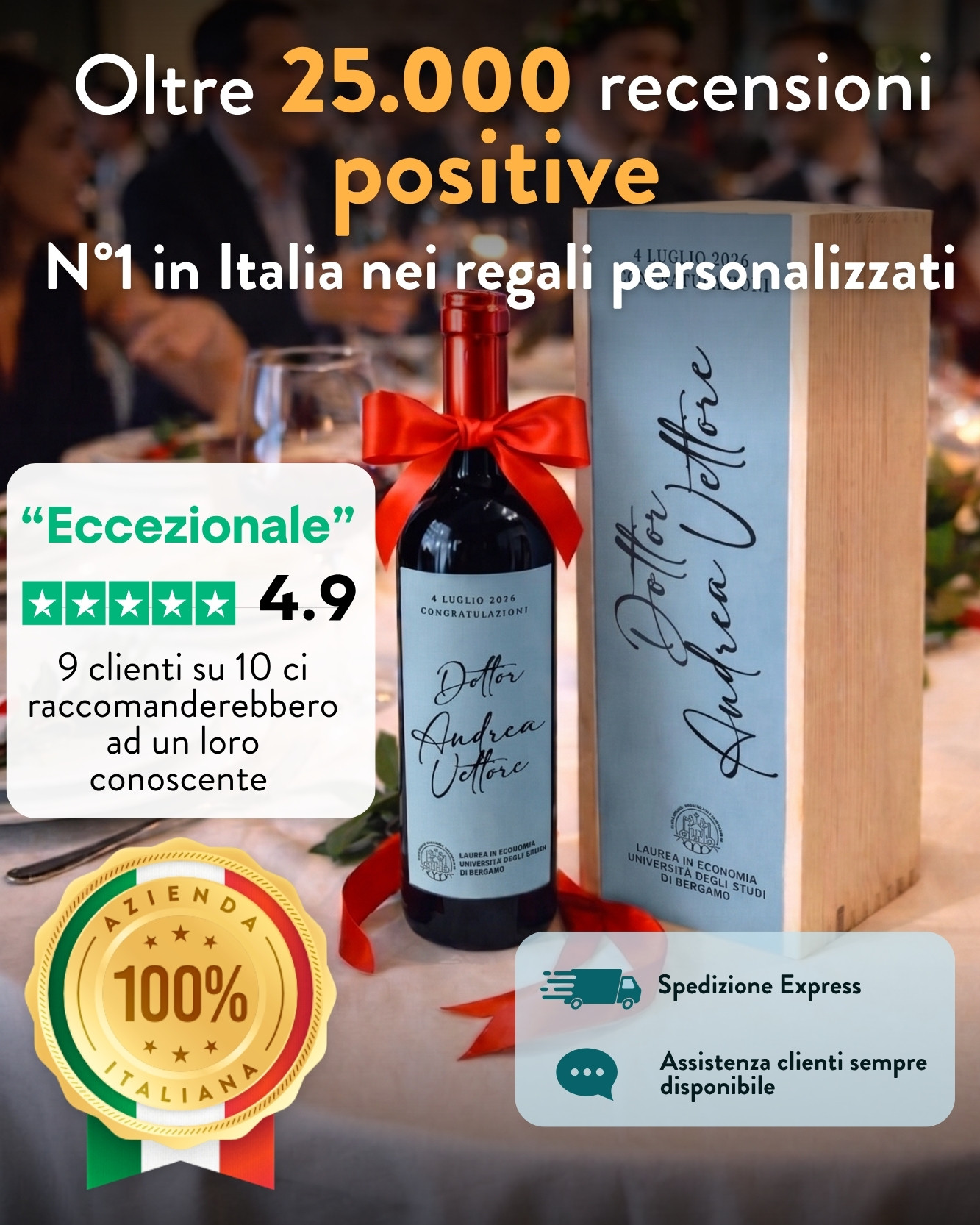 “La consegna è andata benissimo, il prodotto soddisfa le aspettative: è veramente bello, sia la bottiglia sia la cassettina, e la scrittura su entrambe meritano 5 stelle. Grazie e arrivederci alla prossima.”