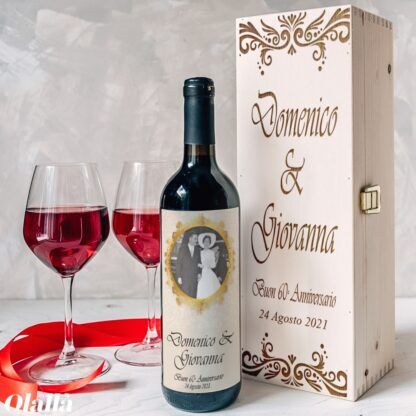 Completa la tua bottiglia con una confezione regalo: puoi scegliere tra una confezione di cartoncino, una cassettina in legno o una cassettina in legno incisa in modo da creare un coordinato.