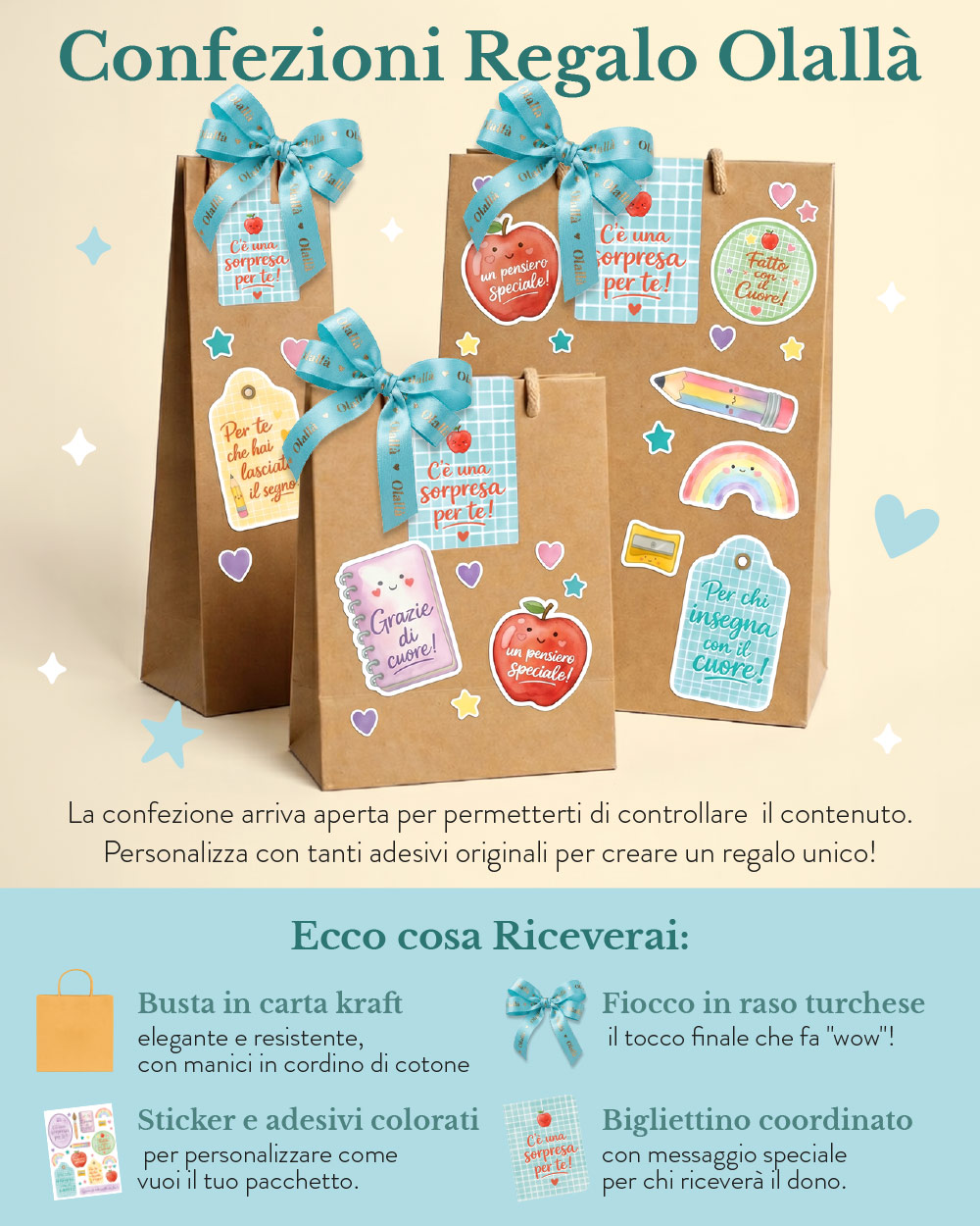 Opzione – Kit Regalo fai-da-te con busta in carta kraft, nastrino in raso, adesivo chiudipacco e stickers.