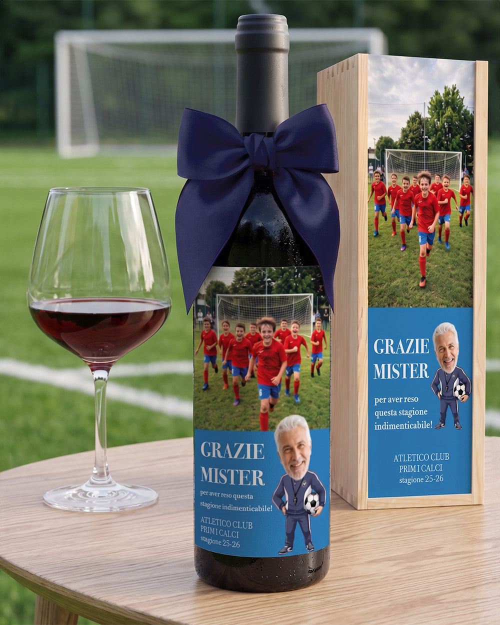 bottiglia vino personalizzata regalo fine stagione allenatore calcio con cassettina in legno