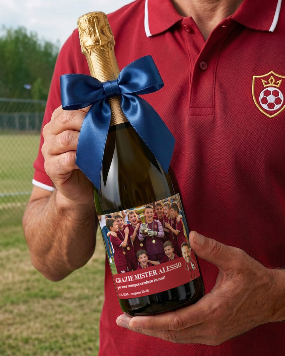 La bottiglia di vino personalizzata per il mister è il regalo pensato per tutte quelle situazioni in cui un semplice “grazie mister” non basta. È perfetta da parte di tutta la squadra — organizzata dai genitori dei pulcini, dai giocatori delle giovanili, dai ragazzi delle prime squadre amatoriali — o da un singolo calciatore che vuole ringraziare chi lo ha visto crescere sul campo.