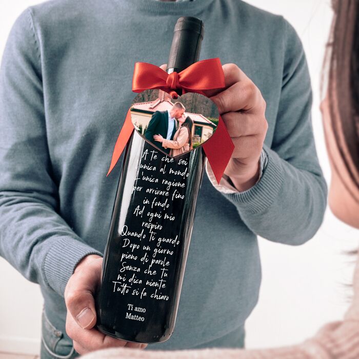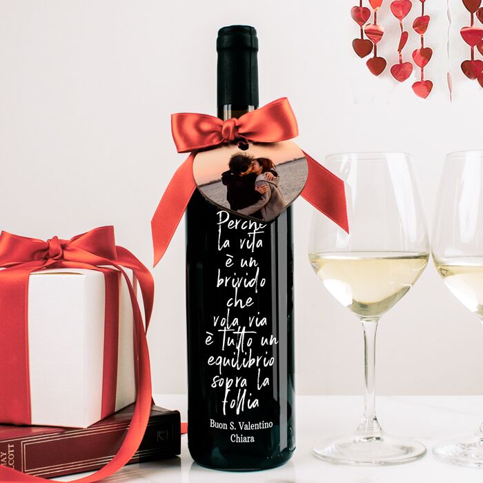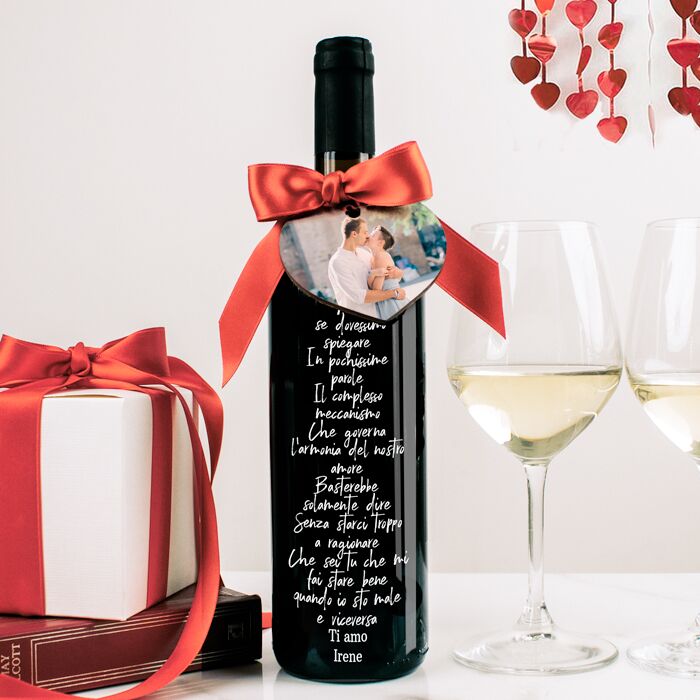 Un messaggio d’amore per San Valentino: dichiara il tuo amore con una bottiglia di vino personalizzata con dedica e decorazione a cuore con foto.