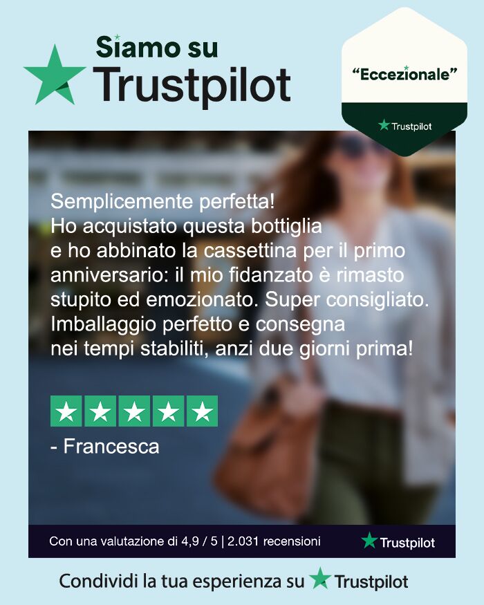 Ho comprato questa bottiglia per un regalo a distanza… è piaciuta tantissimo in tutti i suoi dettagli! Il servizio purtroppo ha avuto dei ritardi,ma ahimè….il periodo storico non aiuta certamente! Il servizio clienti e il servizio grafico cordiali e disponibili!
