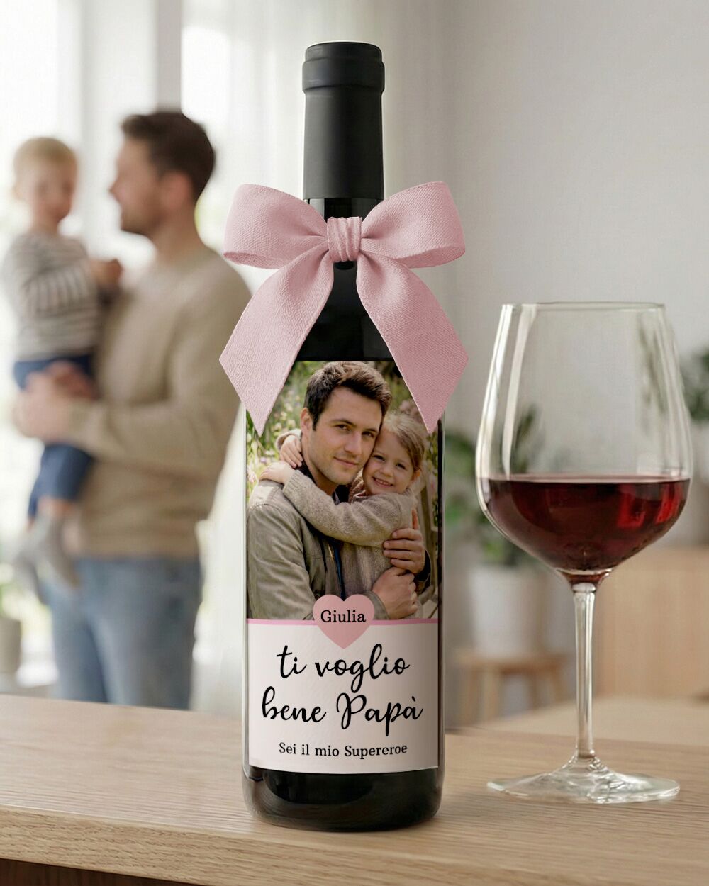 Bottiglia Personalizzata con Foto e Dedica “Ti Voglio Bene Papà” con Fiocco Rosa – Idea Regalo Unica per il Tuo Papà