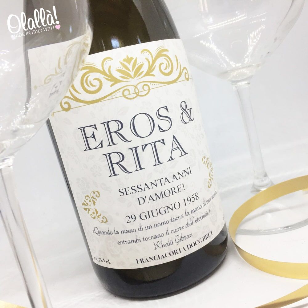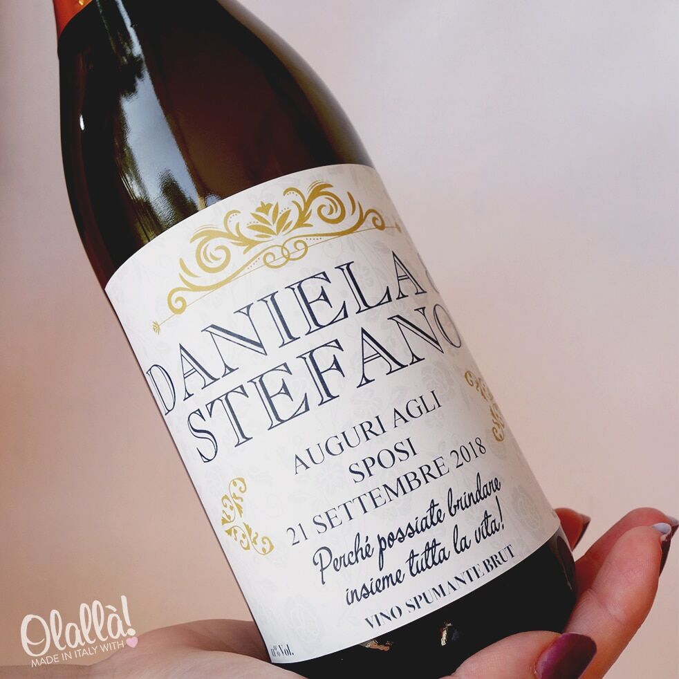 Bottiglia di vino o spumante personalizzata con il nome degli sposi, la data del matrimonio ed una dedica speciale che vorrete dedicare agli sposi o ai vostri invitati. Ideale per donare un tocco di classe al vostro banchetto nuziale, splendida come regalo da fare agli sposi, anche abbinandola ad una cassettina con la stessa personalizzazione.