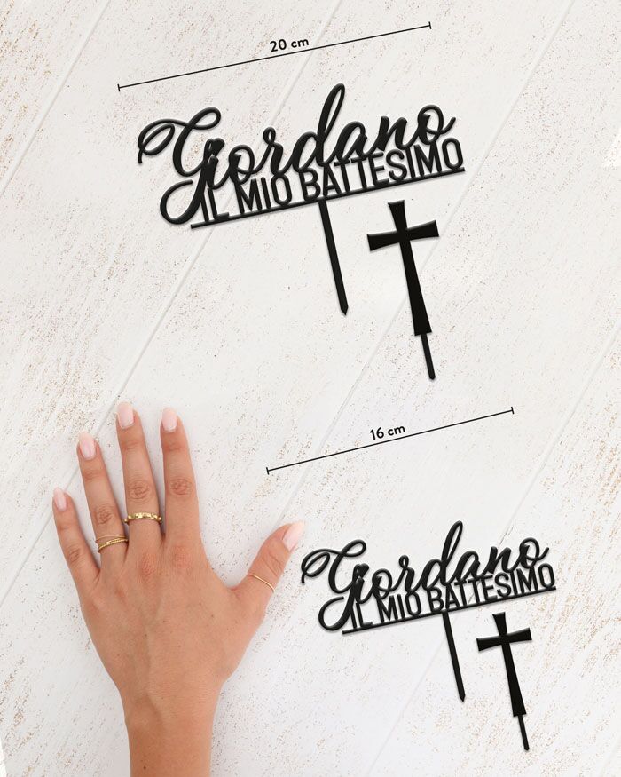 Bellissimo cake topper pensato per il battesimo del tuo angioletto, personalizzabile con il nome del piccolo e una bellissima croce. Il prodotto è dotato di un piccolo bastoncino che permette l’inserimento sulla torta, ma consigliamo comunque di realizzare “il passaggio” anticipatamente con uno stecchino o un oggetto appuntito, per evitare di danneggiare il cake topper che, essendo sottile, rimane comunque molto fragile. Puoi scegliere il colore che più ti piace (noi abbiamo scelto in foto il blu , trattandosi di un maschietto, ma sono disponibili in diversi colori), e anche una tra 3 diverse dimensioni a disposizione. I nostri grafici saranno a tua disposizione nel caso tu voglia visionare la grafica anticipatamente, ti basterà selezionare l’opzione corrispondente dal menù. Se desideri invece un logo o un disegno personalizzato su misura per il tuo cake topper, contattaci al servizioclienti@olalla.it, saremo a tua disposizione per cercare di accontentarti quanto più possibile.