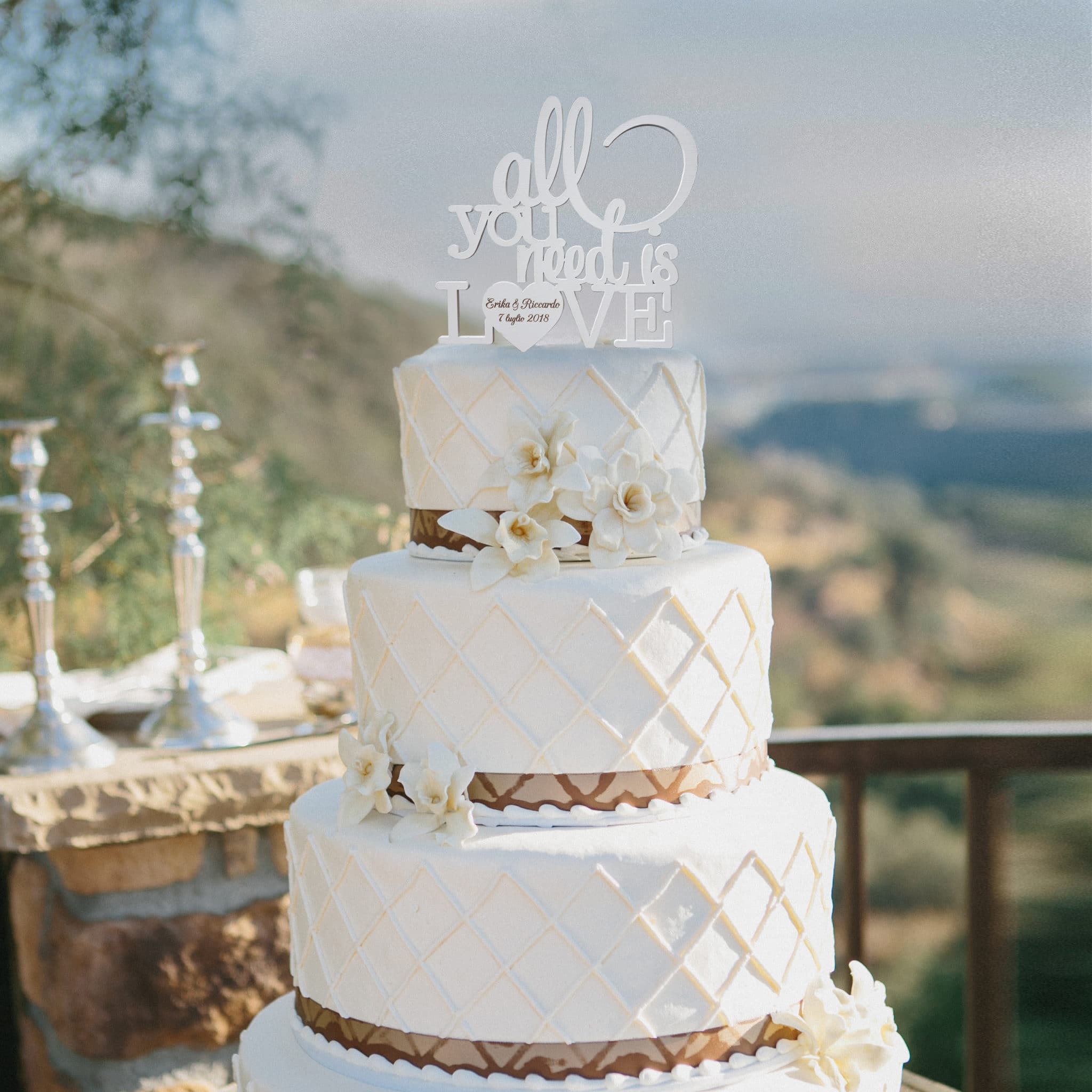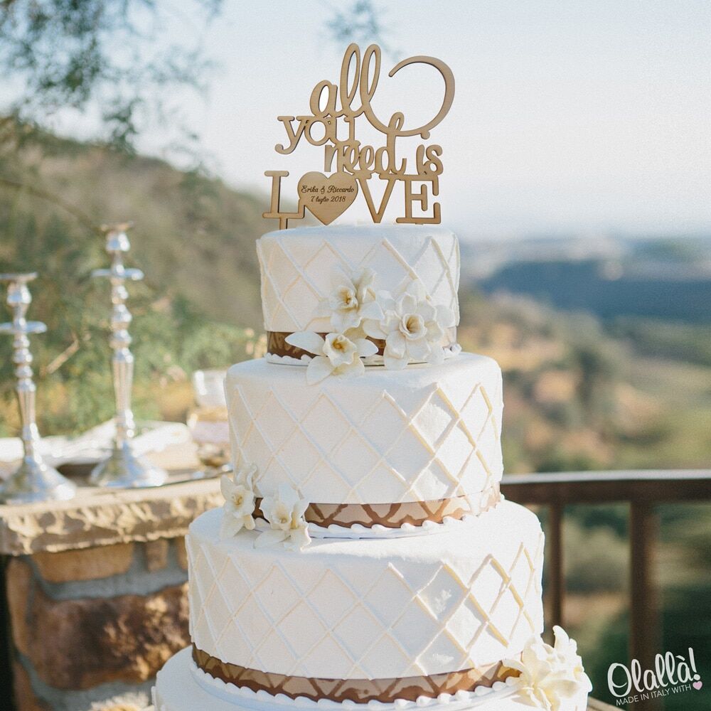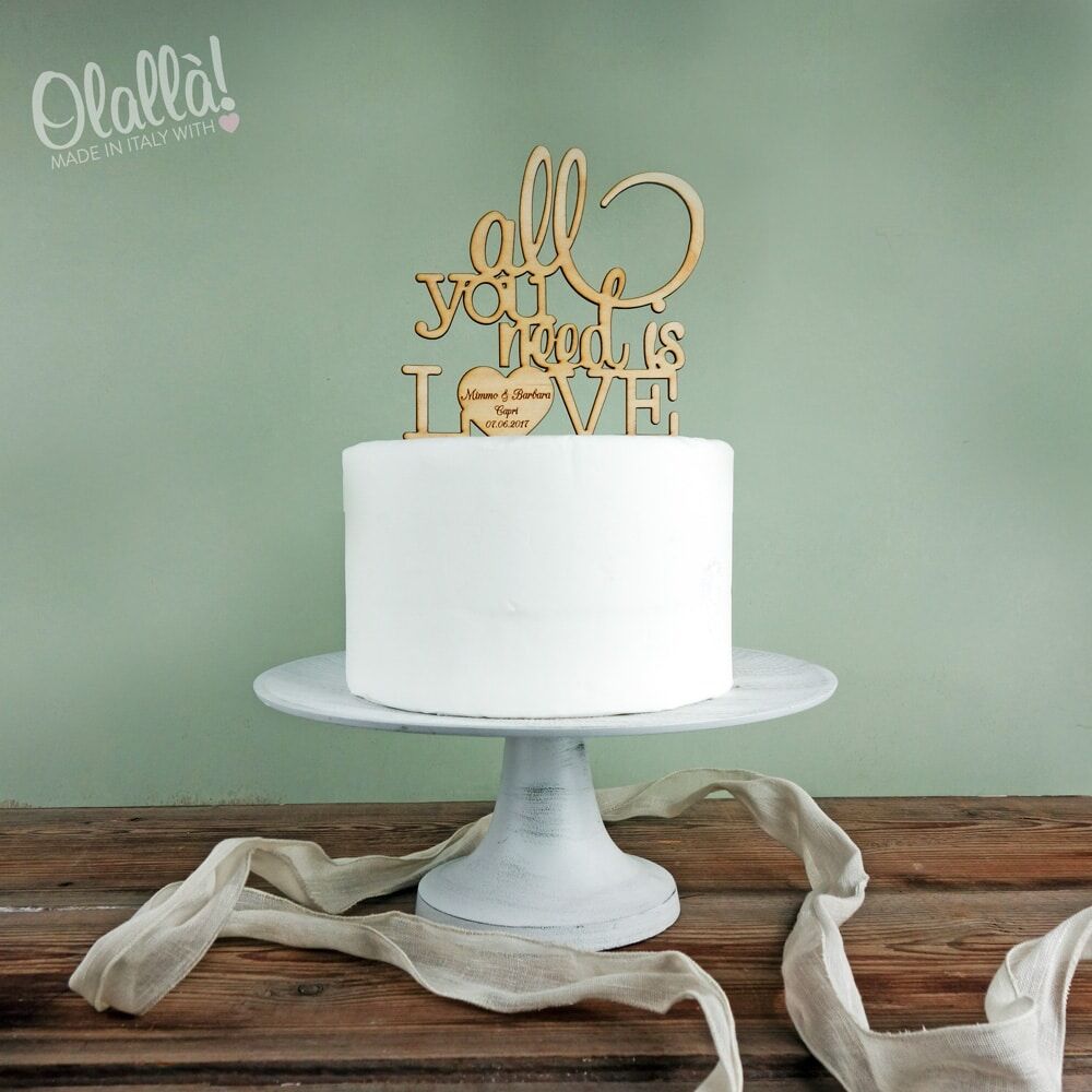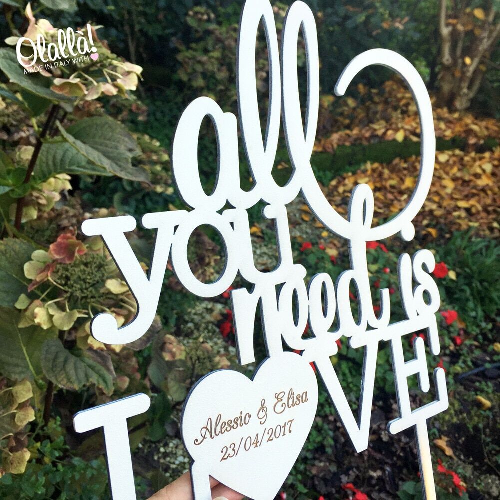 Splendido cake topper “All you need is love” ed i vostri nomi con la data del matrimionio. Un modo originale e molto personale per dare un tocco unico alla vostra torta nuziale. Vi basterà semplicemente inserirlo sulla base più alta della vostra torta di matrimonio per trasformare con stile il look della stessa.