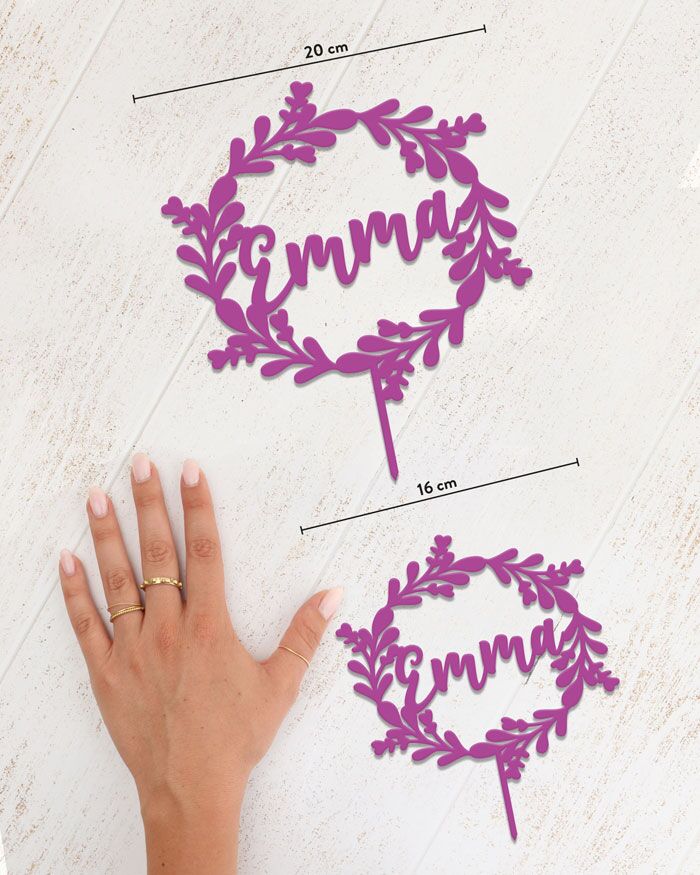 Splendido cake topper con il tuo nome racchiuso da un’ elegante decorazione foliage. Un modo originale e molto personale per dare un tocco unico alla vostra torta, in qualunque occasione! Vi basterà semplicemente inserirlo sulla base più alta della vostra torta per trasformarla con stile.