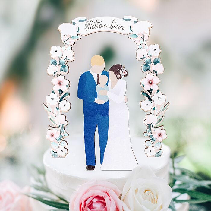 Bellissimo Cake Topper in legno personalizzato per decorare la tua torta nuziale, formato dalla coppia di sposi e personalizzabile con l’aggiunta del neonato, del bambino oppure del cane. Rendi perfetta la tua torta di matrimonio creando il tuo cake topper personalizzato per rappresentare la tua famiglia e dare un tocco finale di classe alla tua cerimonia. Questo cake topper personalizzabile è interamente fatto a mano e lo potrai conservare come ricordo di questo magnifico giorno per tutta la vita.