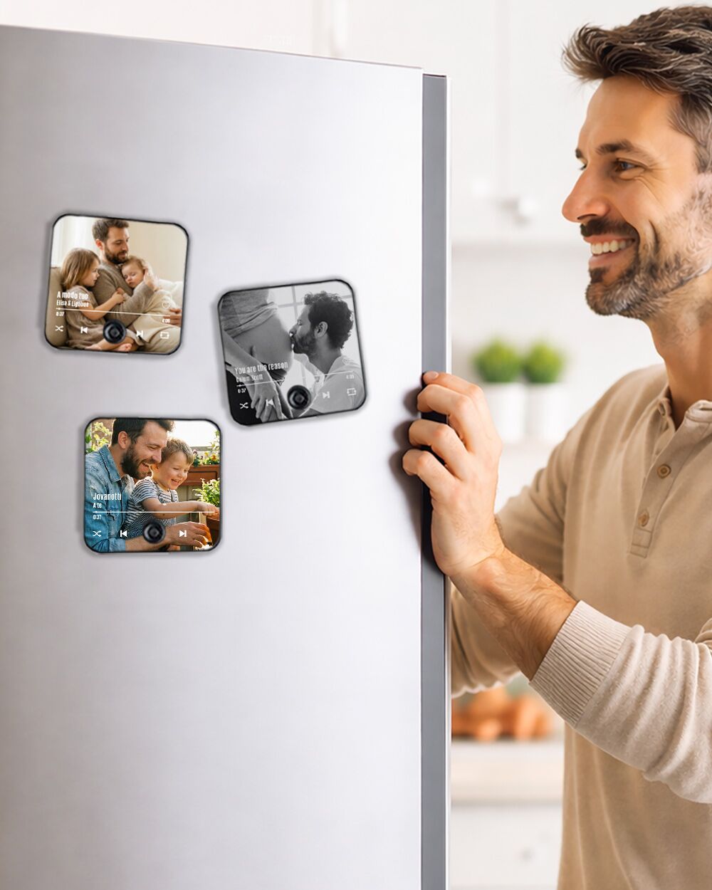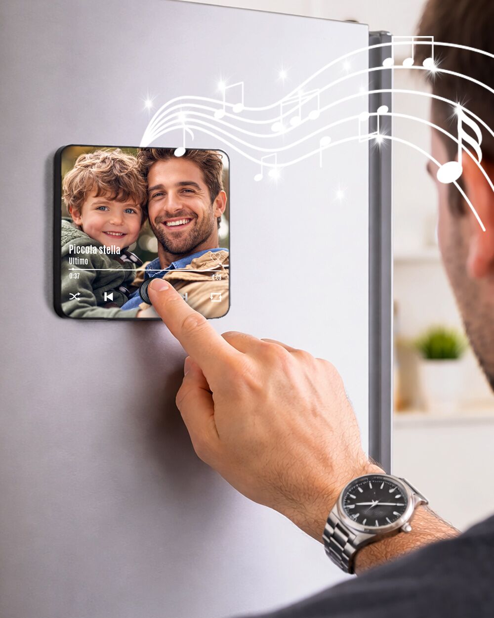 Questo magnete musicale personalizzato non è un semplice oggetto, ma una finestra viva sui vostri ricordi più belli. Immagina la sorpresa di chi ami quando, avvicinandosi per la colazione, vedrà il vostro sorriso stampato e, premendo un piccolo tasto, ascolterà la vostra canzone del cuore riempire la stanza. Un’esperienza sensoriale che unisce la vista e l’udito, capace di trasformare la routine in pura emozione ogni volta che si apre il frigo.