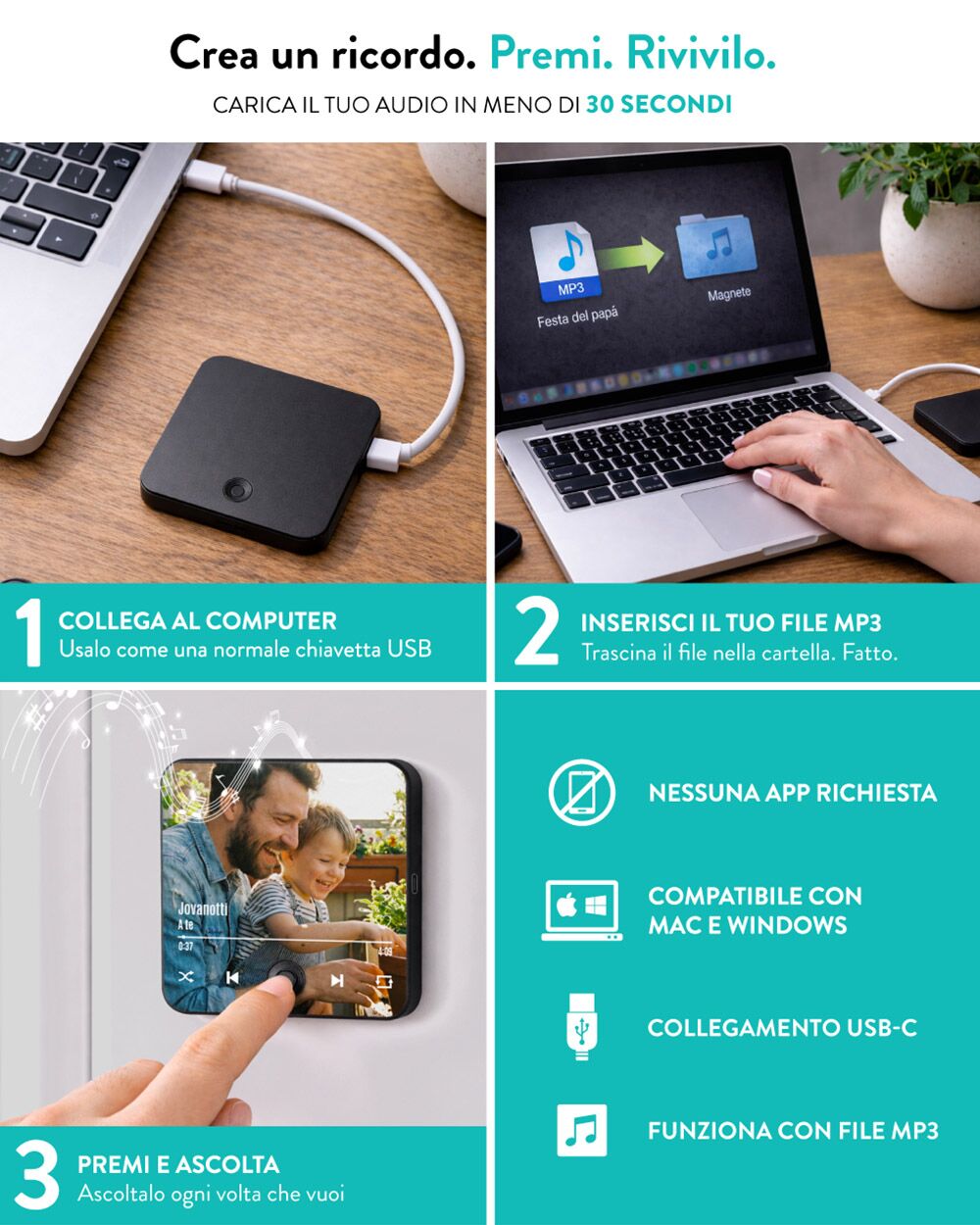 Se sei alla ricerca del regalo per il papà definitivo, o vuoi commuovere fino alle lacrime un neo papà, hai trovato l’idea vincente. Questo scrigno di tecnologia e amore è il regalo festa del papà ideale, ma è meraviglioso anche per celebrare un compleanno, un anniversario o semplicemente per dire “ti voglio bene”. Immagina lo stupore nei suoi occhi quando scoprirà che la sua calamita da frigorifero non si limita a tenere in ordine gli appunti, ma custodisce la ninna nanna del suo bambino o la canzone che ha segnato il vostro primo viaggio insieme. È un effetto “wow” garantito che toccherà le corde dell’anima.