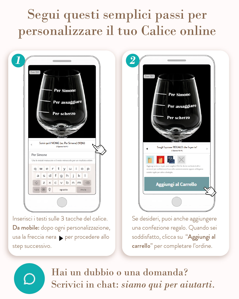 Il risultato è un calice personalizzato con nome e frasi, pensato esclusivamente per chi lo riceve.