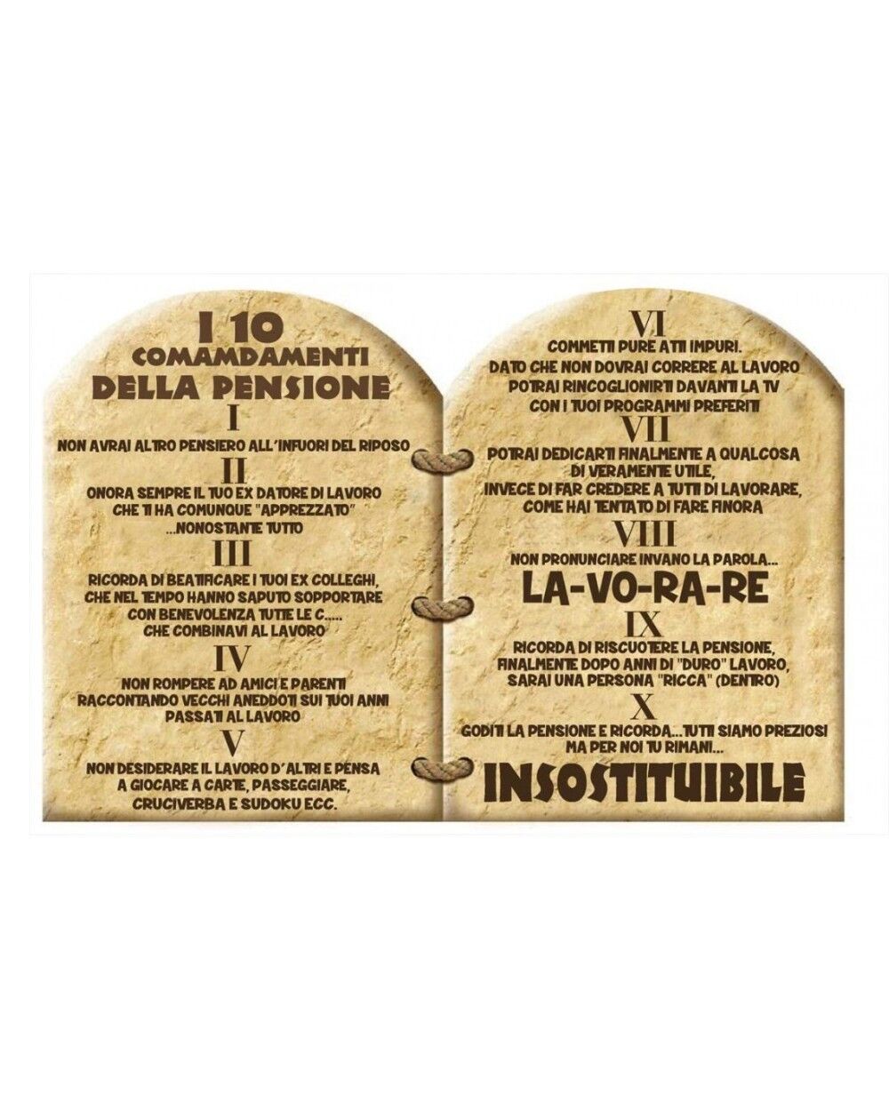 • Pergamena decorativa con i “10 Comandamenti della Pensione”, un elenco simpatico di consigli e verità (più o meno sacre!) per godersi al meglio la nuova vita da pensionato