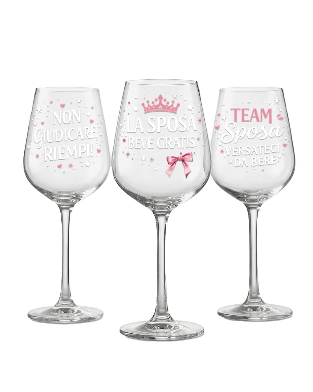 Puoi acquistare le versioni singolarmente o combinarle per avere il set completo — uno per la sposa, tre per le amiche. Tutti i calici sono dello stesso modello, cambiano solo la frase e la sacca coordinata.