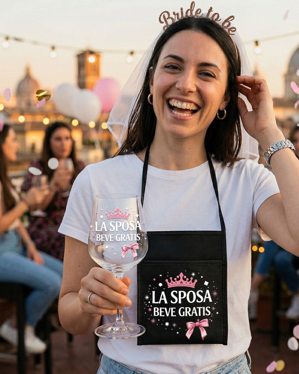 Per la sposa — “La Sposa Beve Gratis”: perché se c’è un giorno in cui il calice non deve mai svuotarsi, è questo. La versione dedicata alla festeggiata, riconoscibile al volo.
