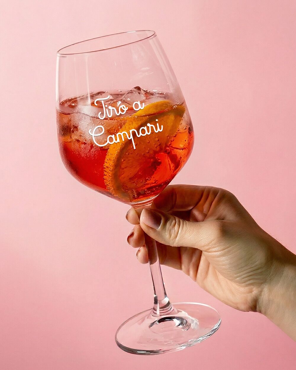 La scritta “Tiro a Campari” è applicata con pellicola adesiva ultra resistente — una tecnologia che garantisce colori netti, bordi precisi e una durata nel tempo degna del prodotto. Il risultato visivo è pulito ed elegante: non sembra un adesivo appiccicato all’ultimo momento, ma parte integrante del calice.