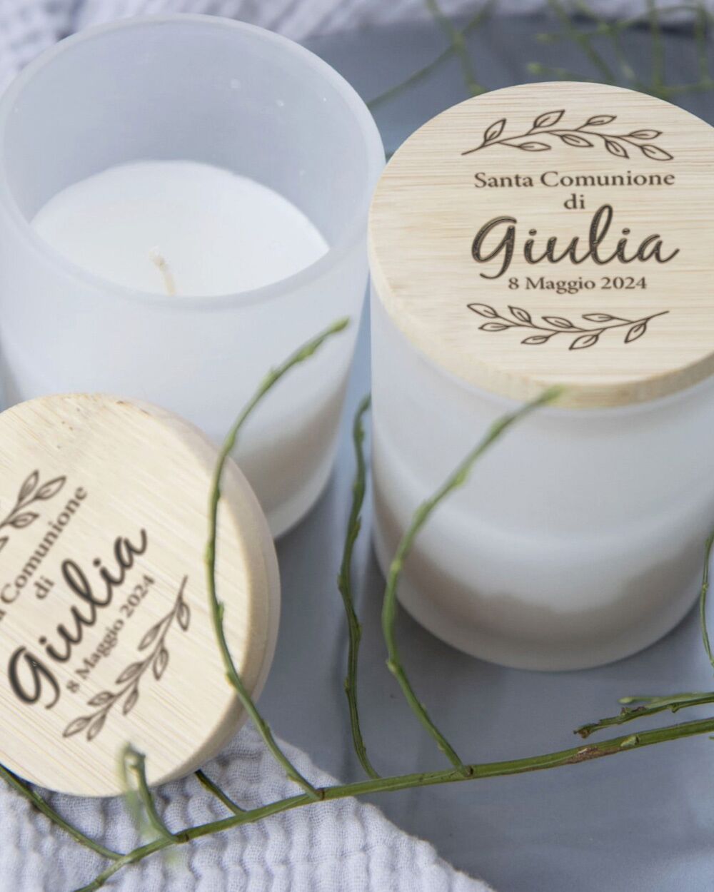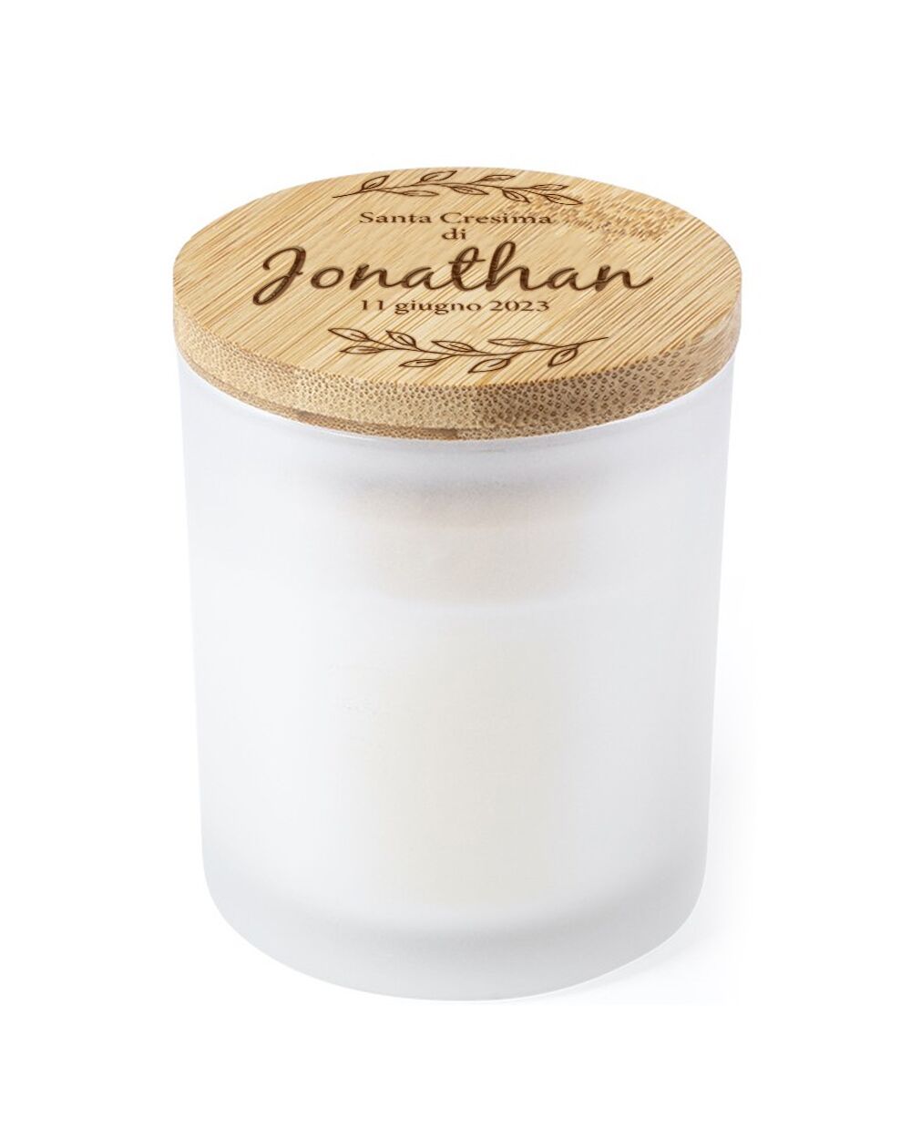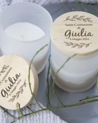 Candela Profumata Personalizzata con Tappo in Bambù Inciso con Nome, Data e Decori Botanici – Idea Bomboniera per Comunione