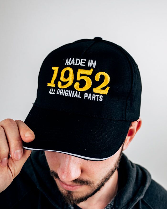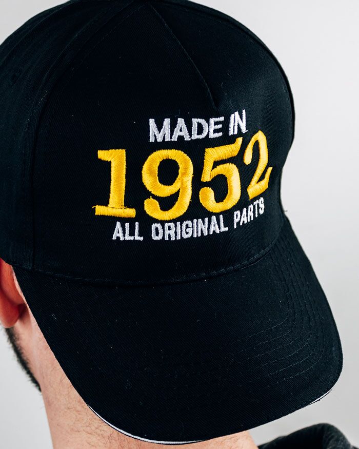 Simpatico Cappellino con Frontino e la scritta ricamata “Made in 1952 – All original parts”. Un gadget casual e comodo da utilizzare in ogni occasione, senza dimenticare la fierezza di essere quelli del ’52! Compagno fidato per soffiare le 70 candeline, questo cappellino è un accessorio super ironico e divertente che non potrà mancare nelle foto di compleanno del papà, zio, nonno o amico!