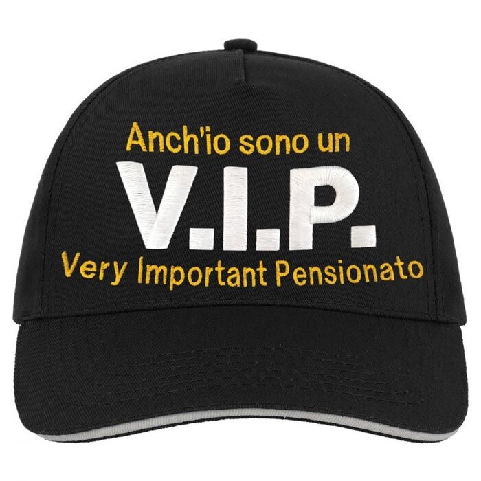 Diverti il tuo novello pensionato con questo simpatico berretto con frontino nero e la scritta ricamata “anche io sono un V.I.P. Very Important Pensionato”. Fallo indossare alla festa del suo pensionamento per renderla ancora più divertente!