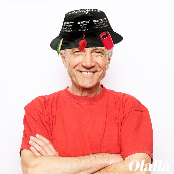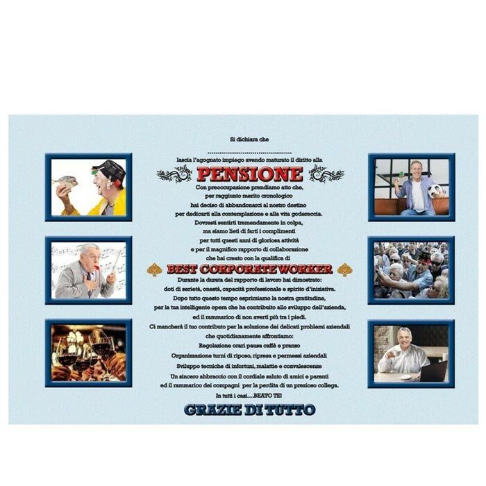 Sulla visiera del berrettino sono stampati i 7 giorni della settimana ed in corrispondenza di ognuno, applicati piccoli accessori, tra i quali: un’esca artificiale da pesca, un fischietto, un apribottiglie, una manina Clapper, un ticket eliminacode ed una bustina di the. Il cappello è riposto all’interno di un tubo rivestito con un attestato di pensionamento dalle battute simpatiche e goliardiche e su cui scrivere il nome del festeggiato, per renderlo ancora piu’ personale.