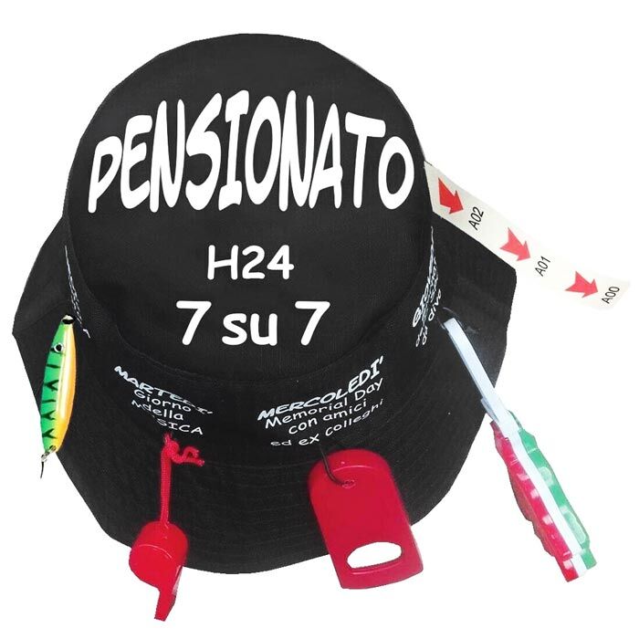 Cappellino in poliestere nero da pescatore in taglia unica, si adatta comodamente alla maggior parte delle persone, diventando il capo clou del perfetto outfit del Pensionato 24 ore su 24 e 7 giorni su 7. Questo cappellino stile pescatore, oltre che a proteggere dal sole il nuovo Umarell che passerà il tempo a guardare i cantieri di lavori stradali con le mani giunte dietro la schiena offrendo consigli indesiderati, diventerà anche, data l’età del pensionato, un ottimo promemoria settimanale delle altre importanti IN-attività che occuperanno l’avventurosa vita da pensionato ufficiale, preparandolo anche alle emergenze.