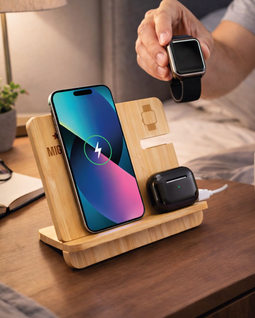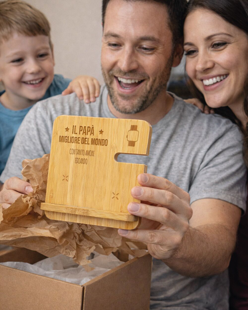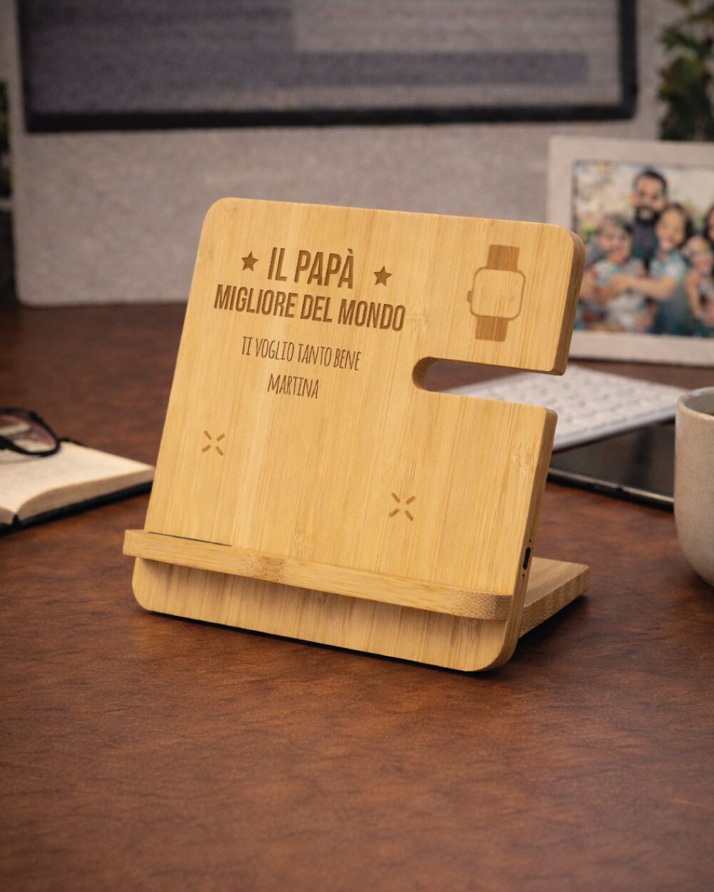 Questa stazione di ricarica wireless 3-in-1 personalizzata in bambù è pensata per il papà che ogni sera appoggia sul comodino telefono, cuffie e orologio. Con un solo accessorio ricarica tutto, senza cavi. Sulla superficie in legno naturale incidiamo la tua dedica — “Il Papà Migliore del Mondo” o le parole che preferisci — per trasformare un gesto tecnologico quotidiano in un piccolo promemoria d’affetto che leggerà ogni giorno.