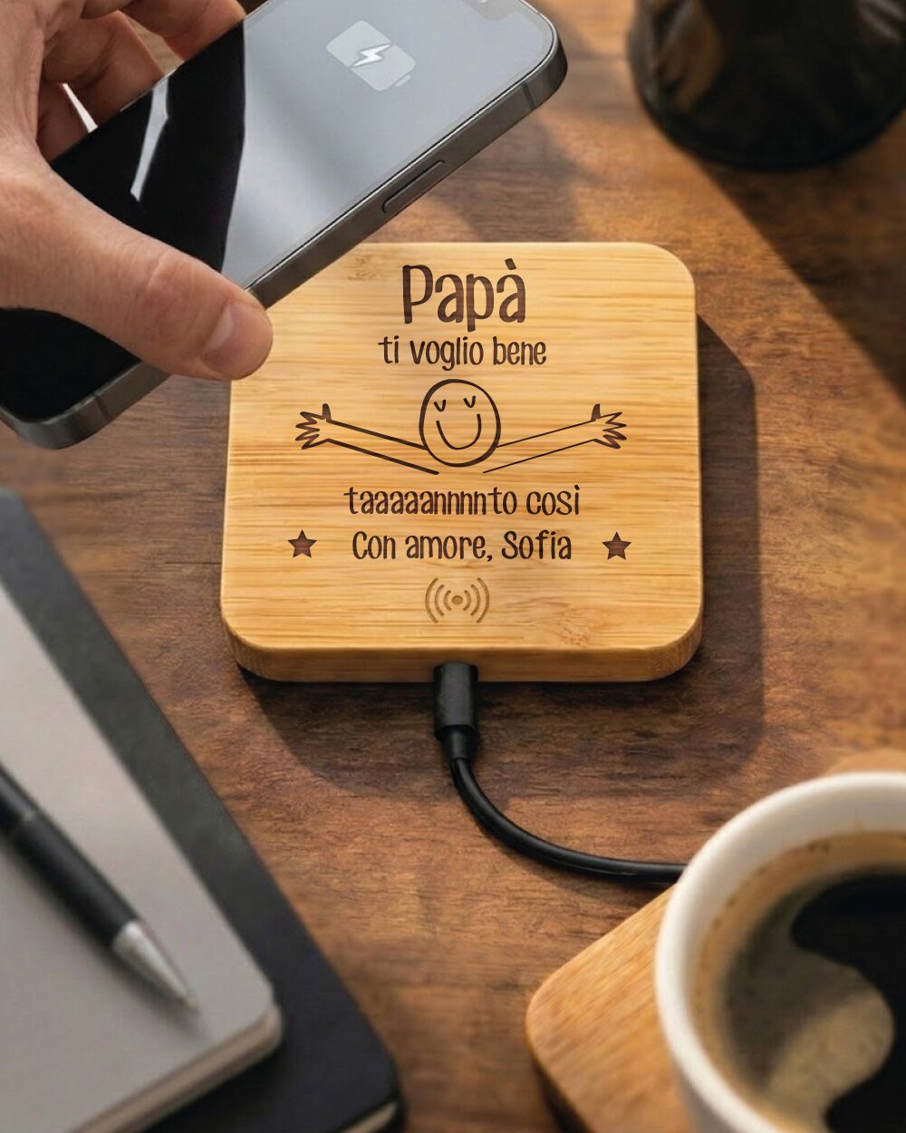 Questo caricabatterie wireless da appoggio è il modo più dolce per ricordare al tuo papà quanto tieni a lui, ogni singolo giorno. Con la tenerissima incisione “Ti Voglio Bene Tanto Così”, trasformerai un semplice accessorio da scrivania in un vero e proprio abbraccio quotidiano. Un piccolo e prezioso gesto capace di ricaricare non solo le batterie del suo smartphone, ma soprattutto il suo cuore, donandogli un’emozione pura e genuina che gli cambierà la giornata.