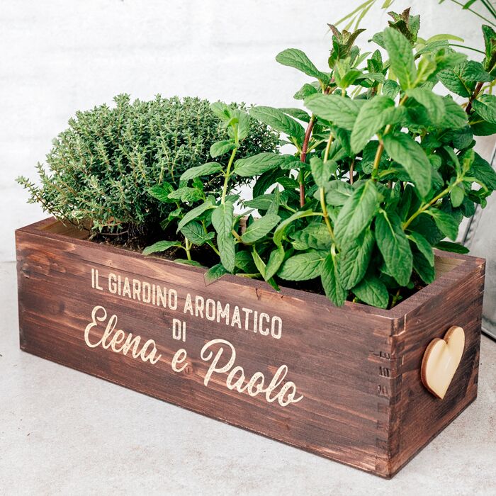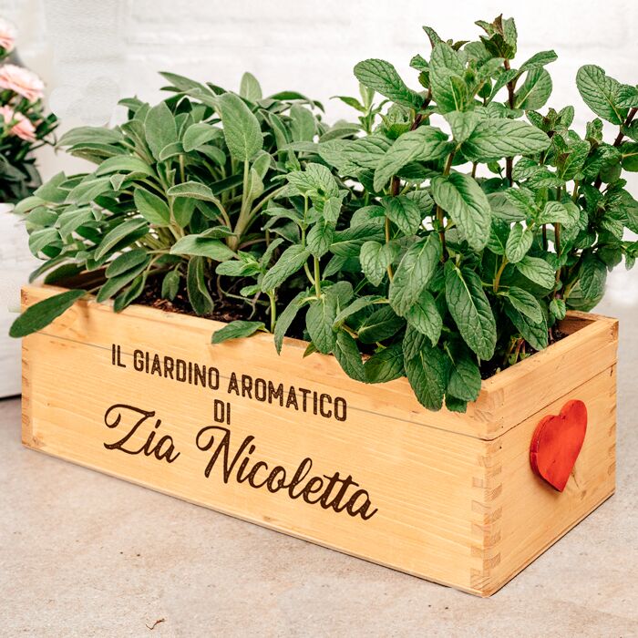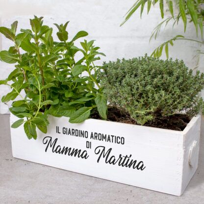 Carinissima fioriera di legno personalizzata con la tua frase speciale. Aggiungi se lo desideri una, o due piantine aromatiche a scelta per completare il regalo e renderlo ancora più spettacolare. Ideale per ogni donna o uomo amante della cucina, questa cassettina porta erbe aromatiche personalizzata sarà un dono super gradito!