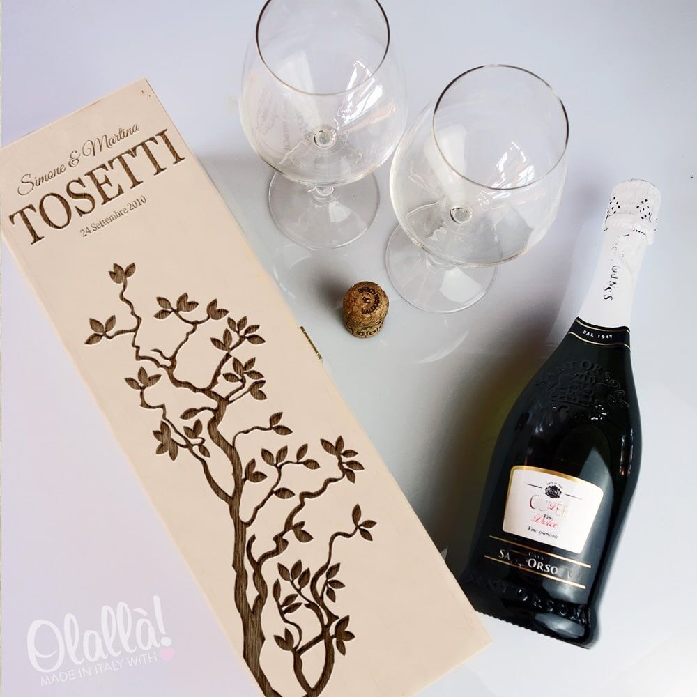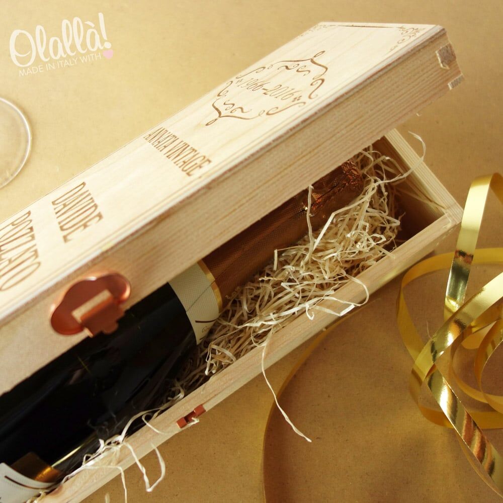 Questa cassetta in legno di pino massello e compensato può contenere una bottiglia di spumante. Il fondo è di compensato in pioppo. Il coperchio in pino massello da 5 mm. Viene venduta completa di paglietta dove poggiare la vostra bottiglia. Ha un fermaglio di lato che consente di chiuderla.