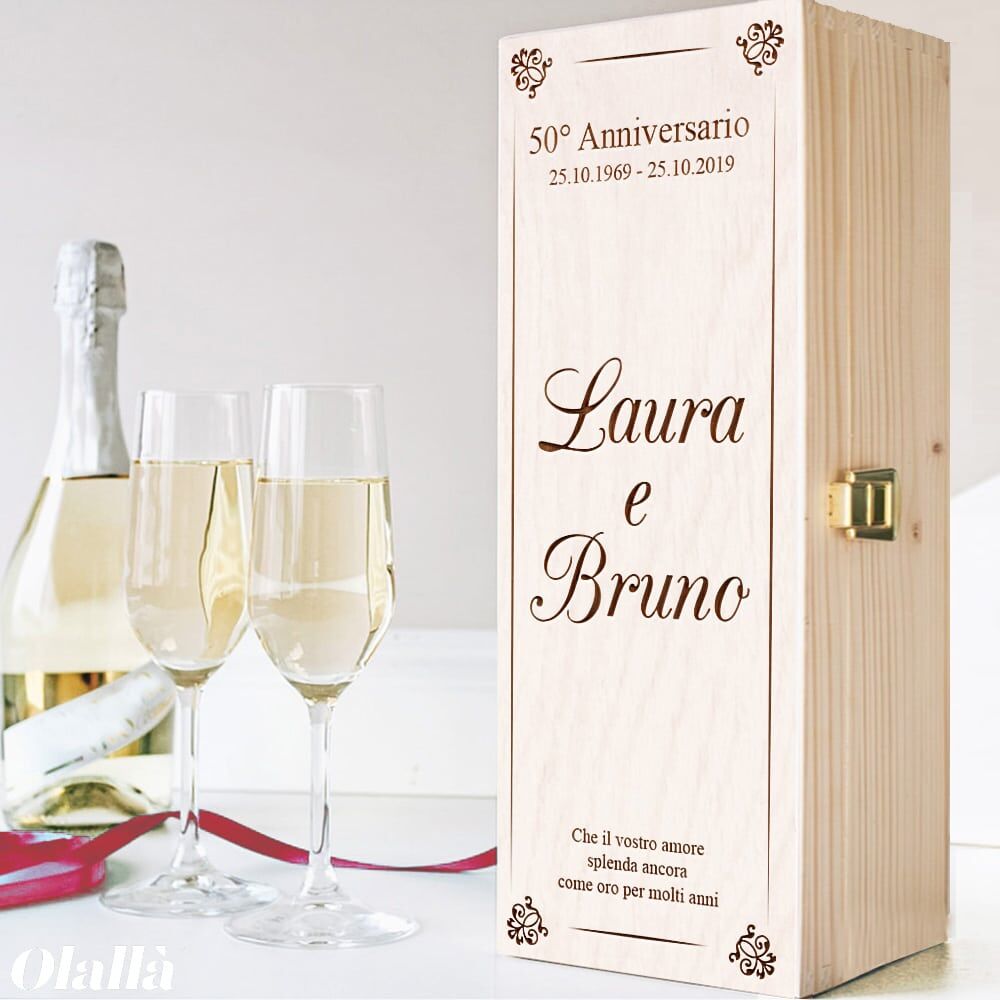 Questa cassettina viene realizzata artigianalmente in legno di pino e abete. Si apre con una clip dorata posta sul lato. Viene venduta completa di paglietta dove poggiare la vostra bottiglia. Se lo desiderate è possibile corredarla di una bottiglia di vino, selezionando la tipologia preferita dal menu a scelta, in modo da realizzare il regalo perfetto. La bottiglia verrà personalizzata con un etichetta che riprodurrà la stessa grafica, in modo da creare un coordinato perfetto.