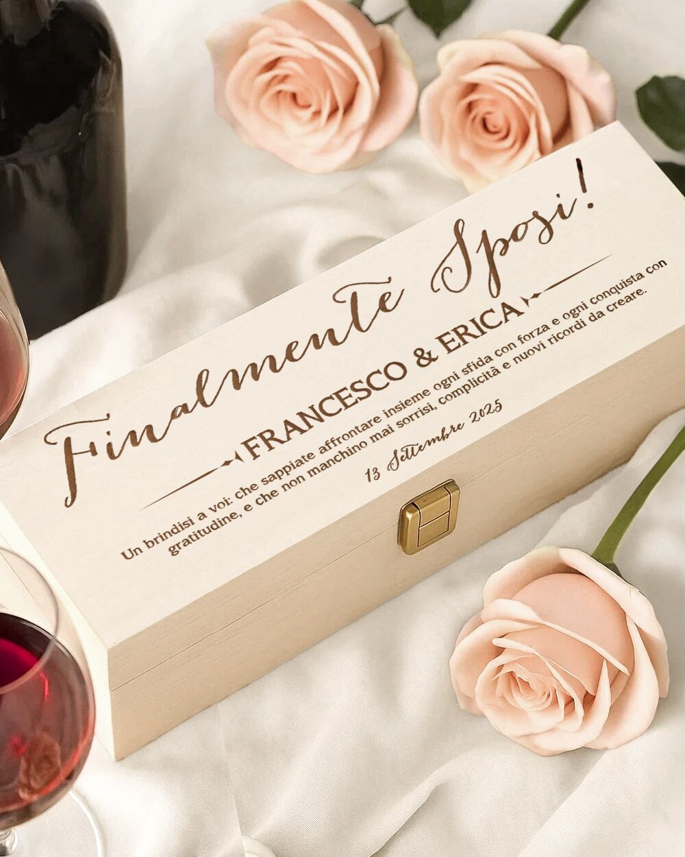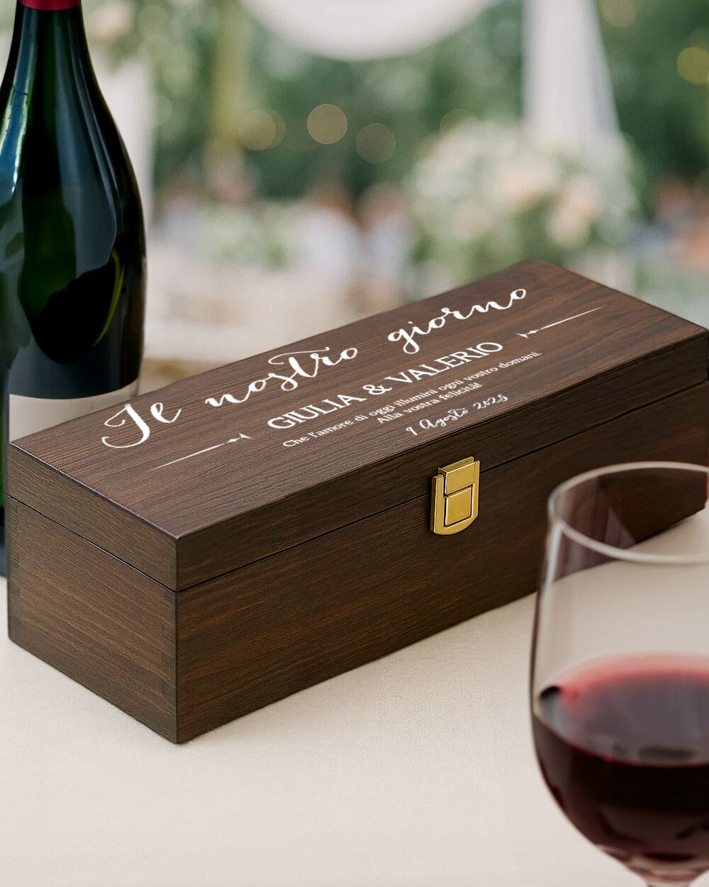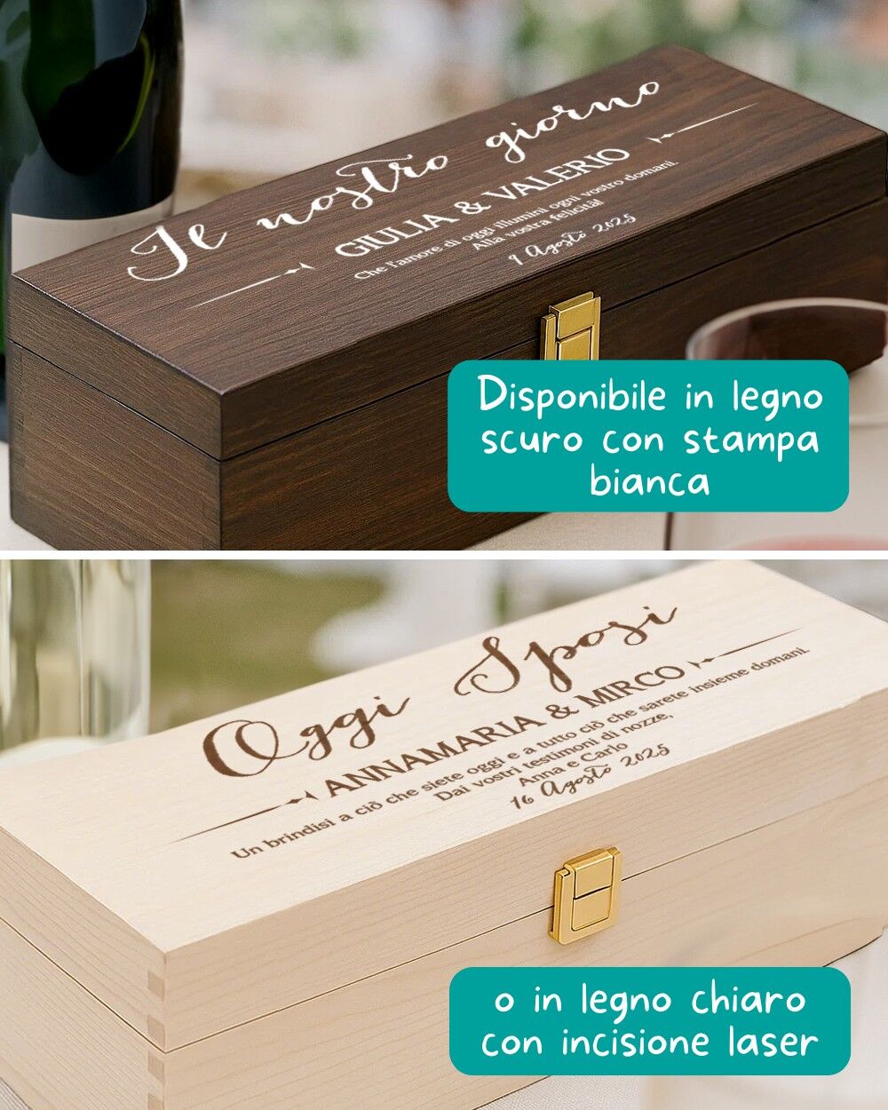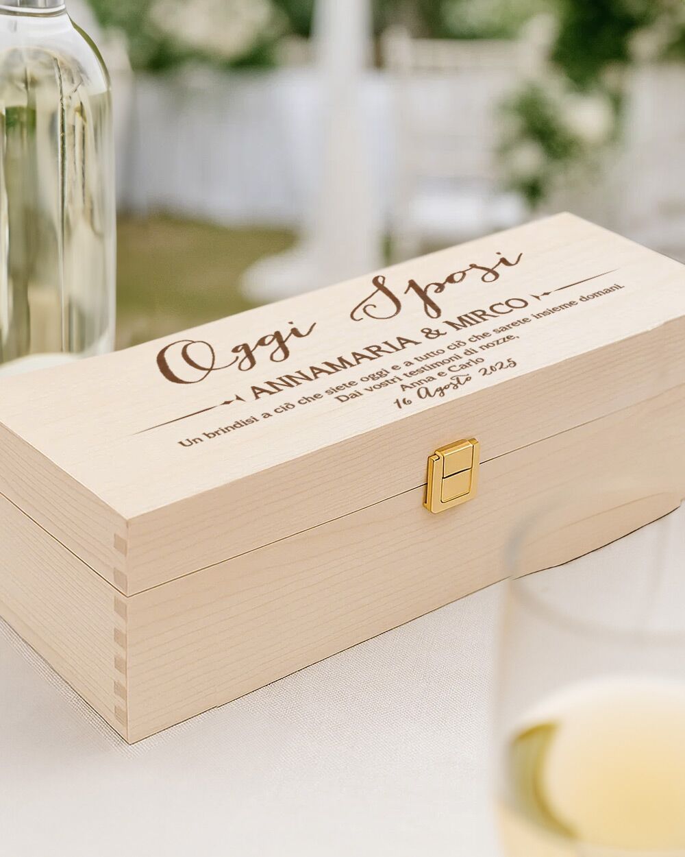PERSONALIZZAZIONE: La cassettina viene personalizzata con lavorazione laser o stampa bianca. Indica intestazione, nomi, data e dedica. Completa il regalo con una bottiglia di vino.