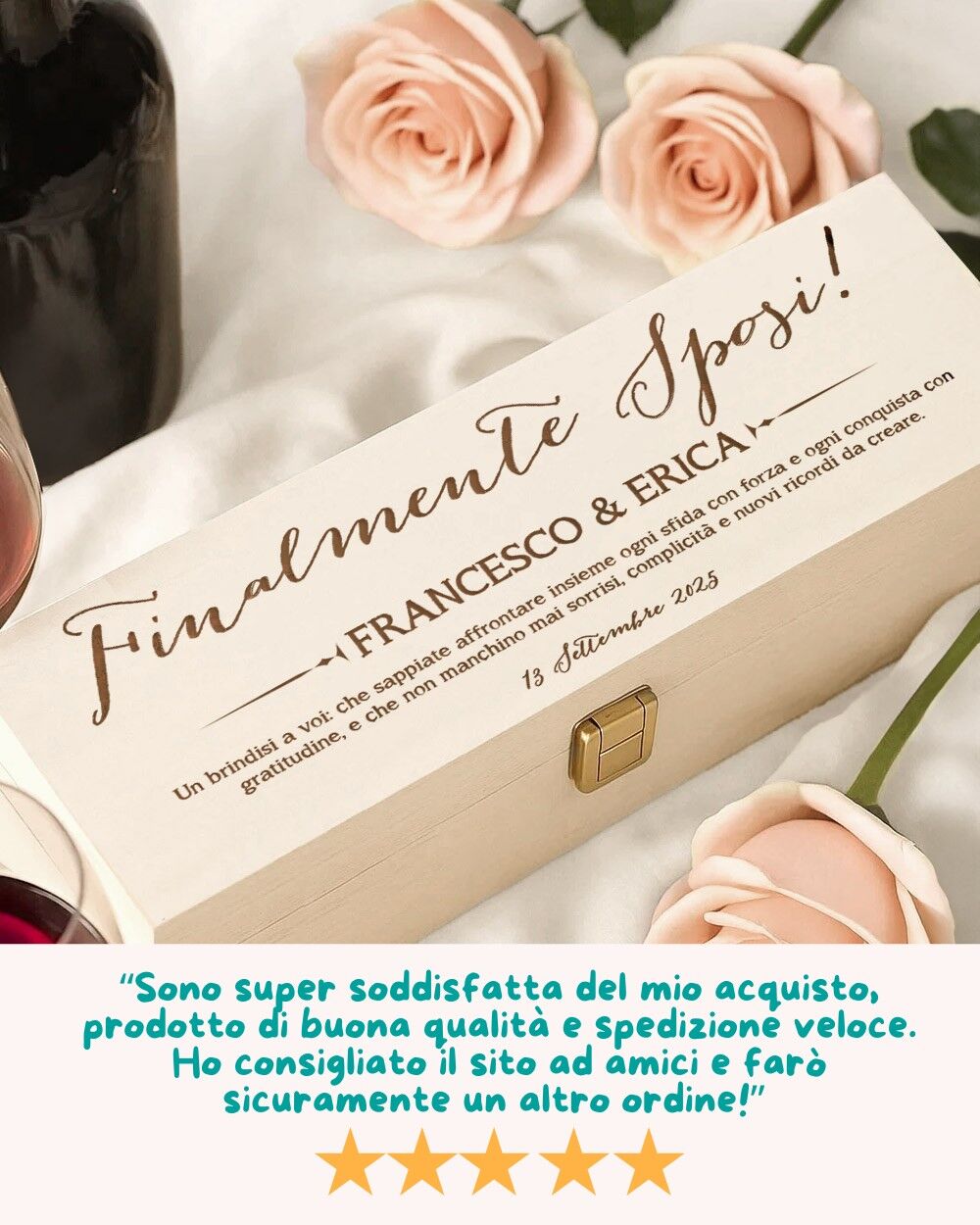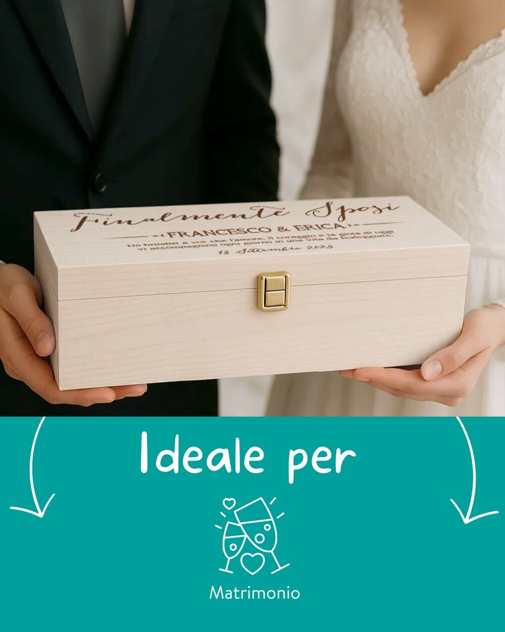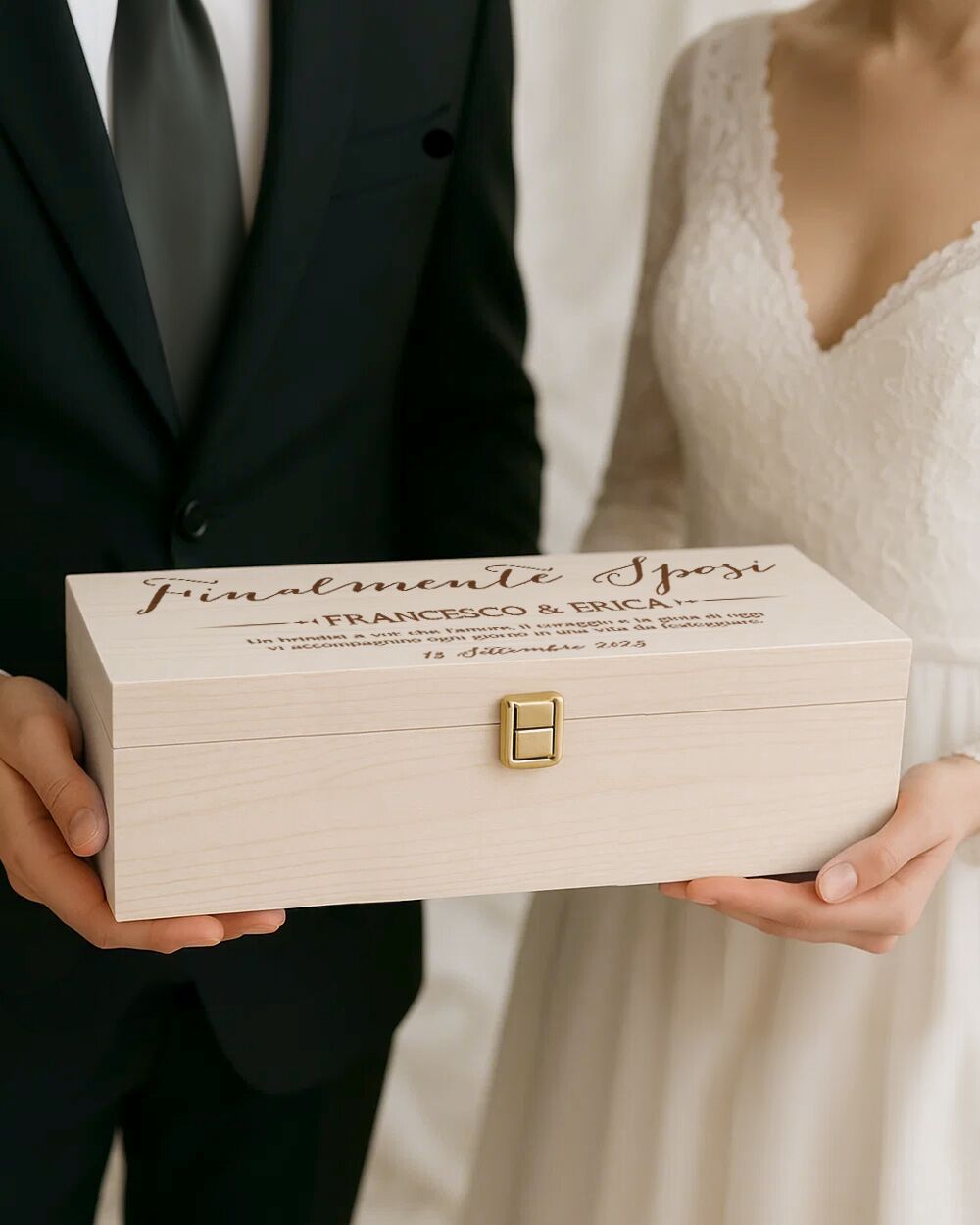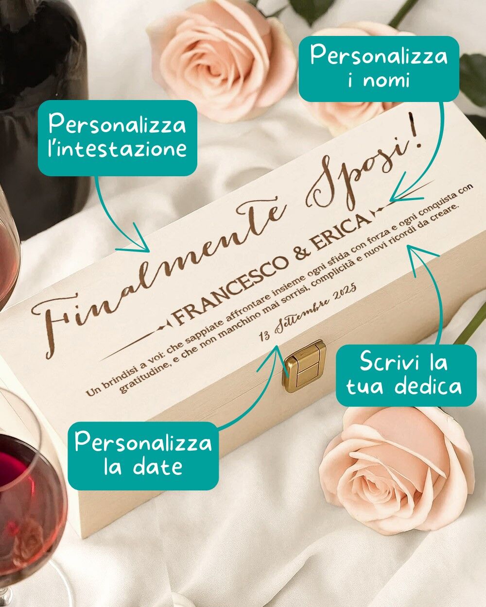 PERSONALIZZAZIONE: La cassettina viene personalizzata con lavorazione laser o stampa bianca. Indica intestazione, nomi, data e dedica. Completa il regalo con una bottiglia di vino.