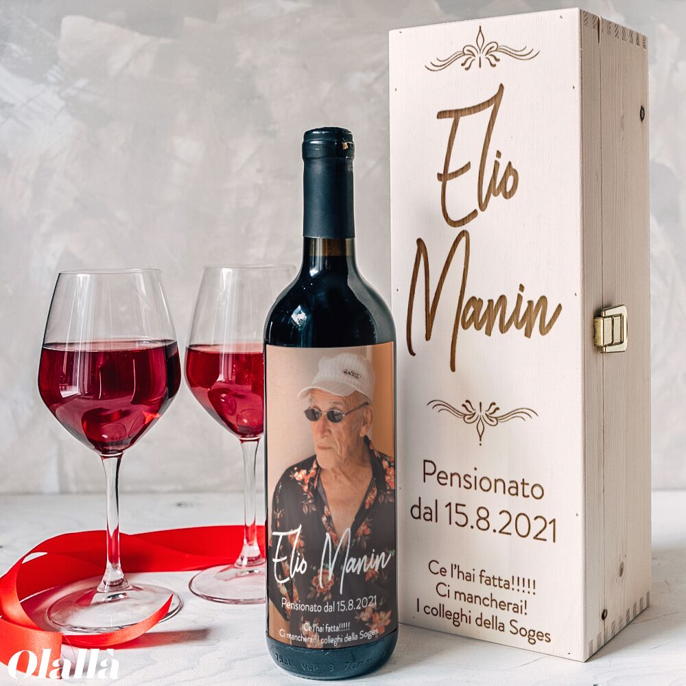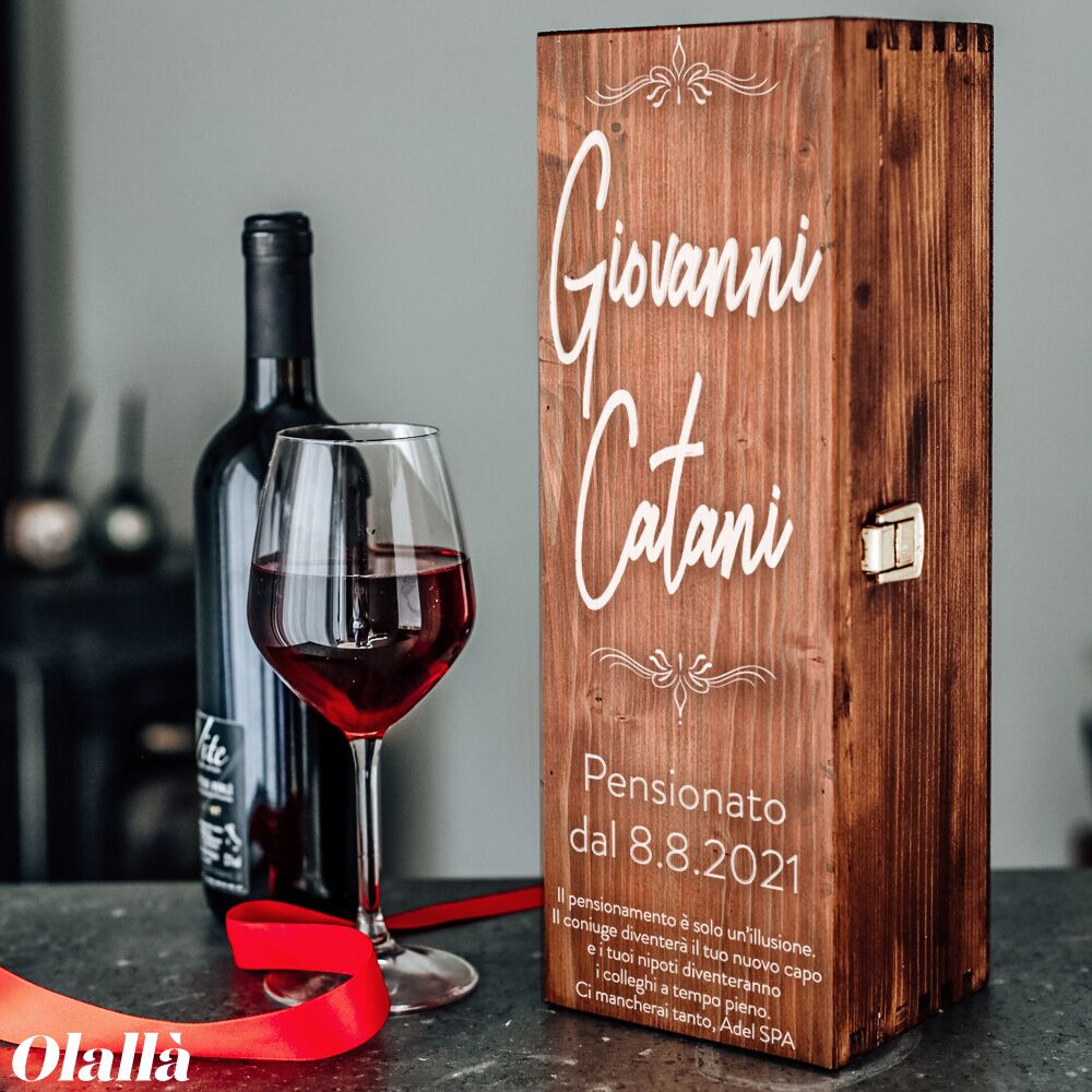 Personalizzate la vostra cassettina seguendo le indicazioni nel menu a tendina. Se lo desiderate è possibile corredarla di una bottiglia di vino o spumante di alta qualità made in Italy e di calici personalizzati in modo da realizzare il regalo perfetto. La bottiglia di vino riporta le stesse informazioni da voi indicate nella personalizzazione della cassettina. Se volete una bottiglia con un’altra grafica o scritta potete acquistarla separatamente ed aggiungerla al carrello assieme alla cassettina. I bicchieri o il bicchiere riporta il nome del festeggiato o dei festeggiati, incisi al laser