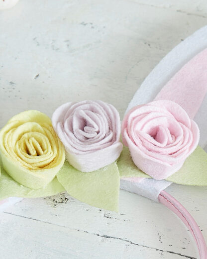 Un simpatico cerchietto pasquale con orecchie da coniglietto e splendide roselline primaverili. Perfetto per essere indossato dalla tua bambina il giorno di Pasqua o per trasformarsi in un simpatico coniglietto durante una fantastica caccia alle uova!