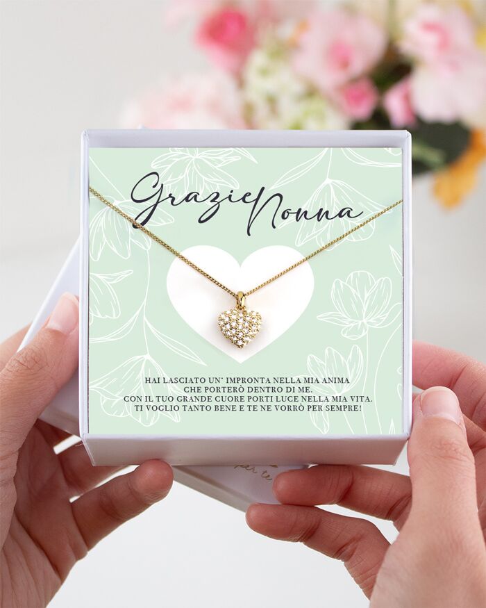 Scegli la dedica che preferisci per personalizzare la confezione regalo di questa splendida collana: nelle foto che vedi in galleria ti proponiamo un’idea, ma puoi scegliere quella che meglio rappresenta il tuo affetto verso la tua nonna del cuore. In questo modo le dimostrerai quanto tieni a lei, in occasione della festa dei Nonni o del suo compleanno.