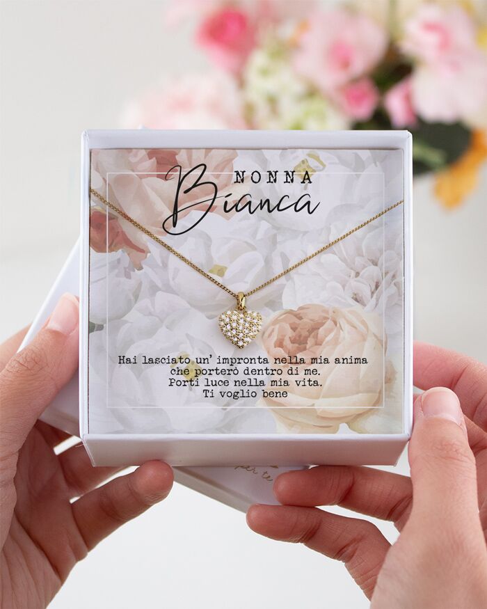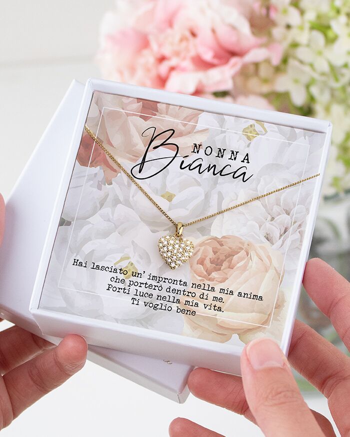 Elegante collana con cuore brillante in oro, confezionata in una bellissima scatolina personalizzata con la dedica per la nonna e una fantasia di soffici fiori. Questo gioiello ricercato è il regalo perfetto per sorprendere la tua nonna nel giorno della Festa dei Nonni o in occasione del suo compleanno.